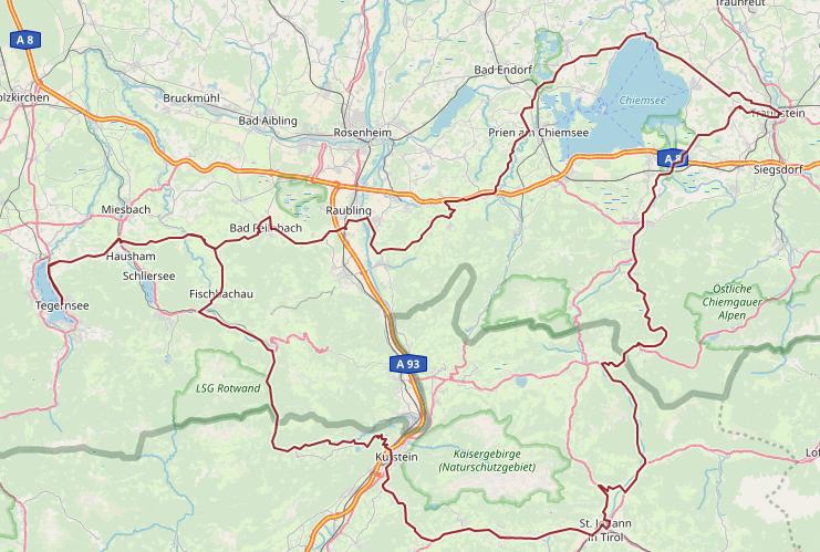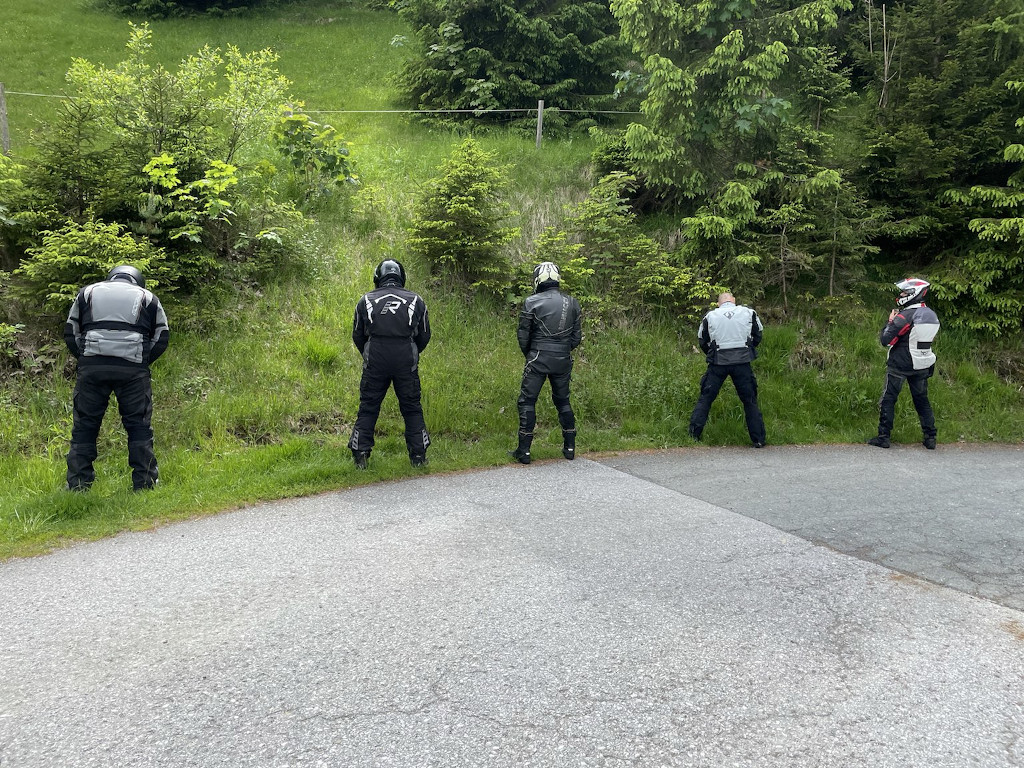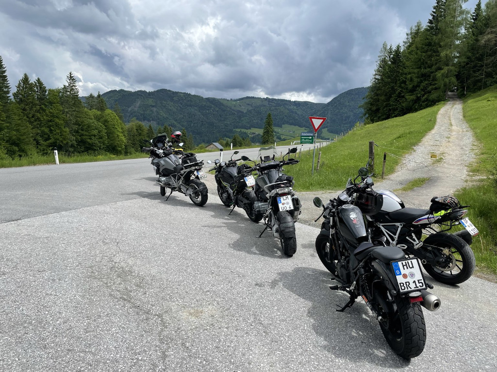 Nach einem gemeinsamen Frühstück starteten wir zu sechst um 10 Uhr, Claus übernahm die Führung. Zur Sicherheit haben wir noch einen Abstecher zum Polo-Shop in Rosenheim gemacht, um Achim mit einem Regenkombi auszustatten, sicher ist sicher. Das Wetter war noch recht schön, sonnig und warm. Die Strecke war richtig prima, mal ein wenig breite, geschwungene Bundesstraße, dann wieder knackige Kurven bergauf und bergab. Mal links, mal rechts tauchten dann die ersten dunklen Wolken auf, es blieb aber immer noch trocken.