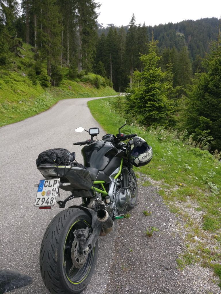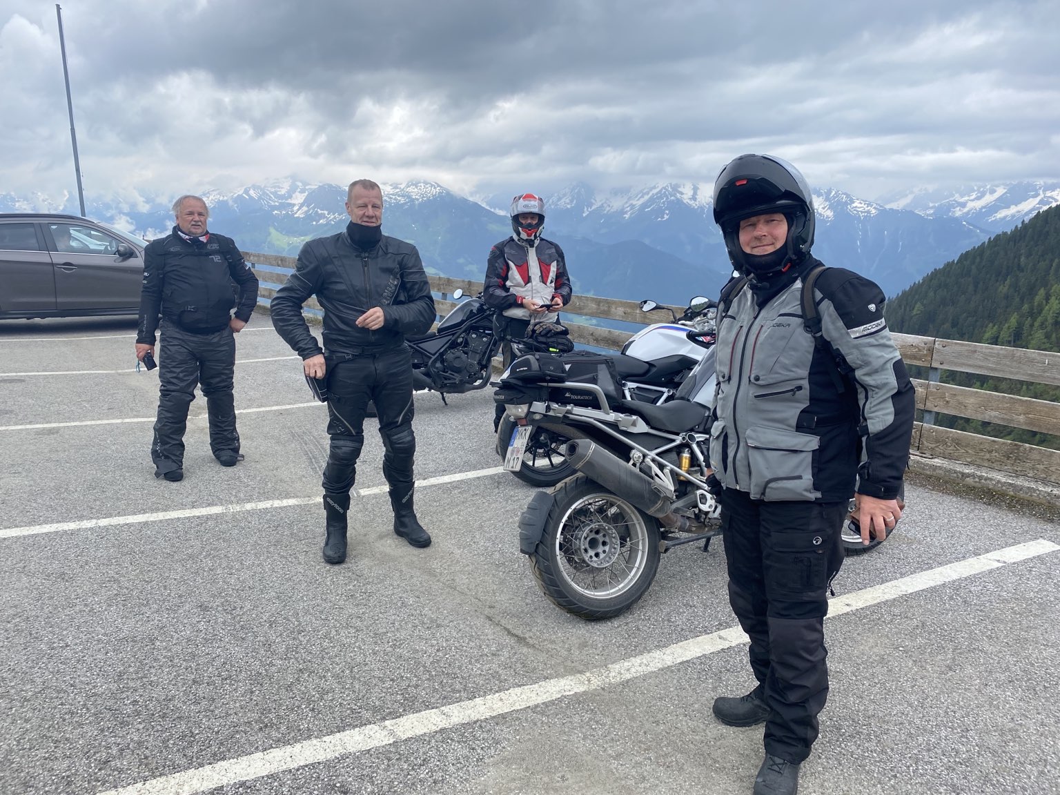 Gegen 10 Uhr war, fast schon traditionell, Abfahrt. Achim, Bernd, Matze und ich starteten Richtung Süden gen östereichische Grenze. Kurz nach der Grenze haben wir dann noch Schappi aufgesammelt. Dann ging es zusammen auf zur Zillertaler Höhenstraße. Diese Panoramastraße ist nicht einfach zu fahren und für Anfänger eher nicht geeignet, entschädigt einen aber mit tollen Ausblicken. Es geht über holprigen Asphalt um engste, unübersichtliche Kehren mit steilen Anstiegen. Rechts geht es den Berg hoch, auf der anderen Straßenseite einen steilen Abhang hinunter, der über große Teile nicht gesichert ist. Da ist volle Konzentration gefordert.