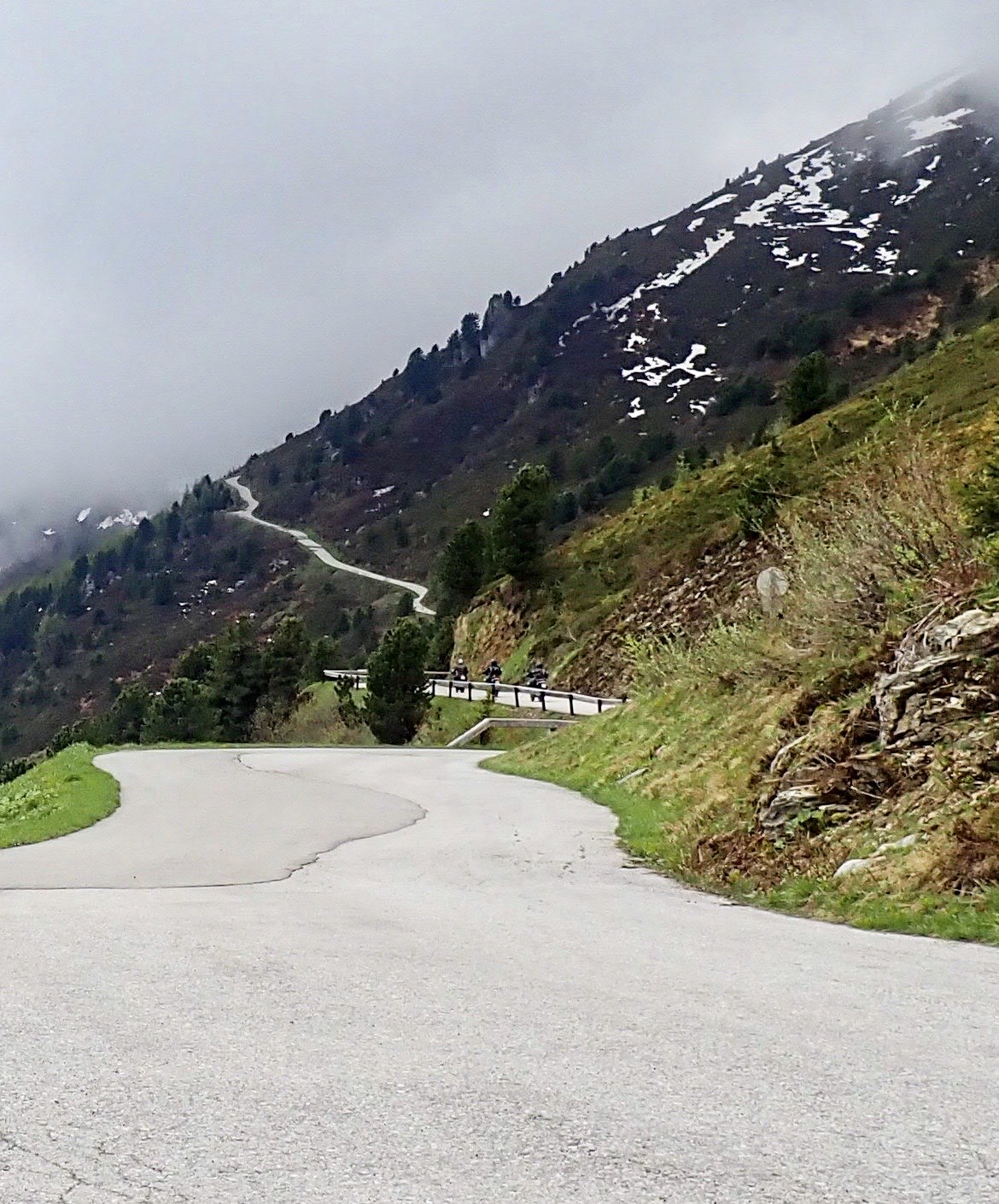 Nach einem Kaffee und einer heißen Suppe (es hatte da oben nur 10°), kletterten wir noch bis auf knapp über 2000 Mtr. Höhe. Dann ging es an den Abstieg, der es ebenfalls in sich hatte. Aber alle kamen heil und mit dem bestimmten Grinsen unter dem Helm unten an. Das war echt ein Erlebnis! Ein großes Dankeschön geht noch an alle Autofahrer, auf die wir auf der Strecke aufholten. Sobald es möglich war, zog jeder nach rechts auf den Seitenstreifen, um uns vorbei zu lassen!
