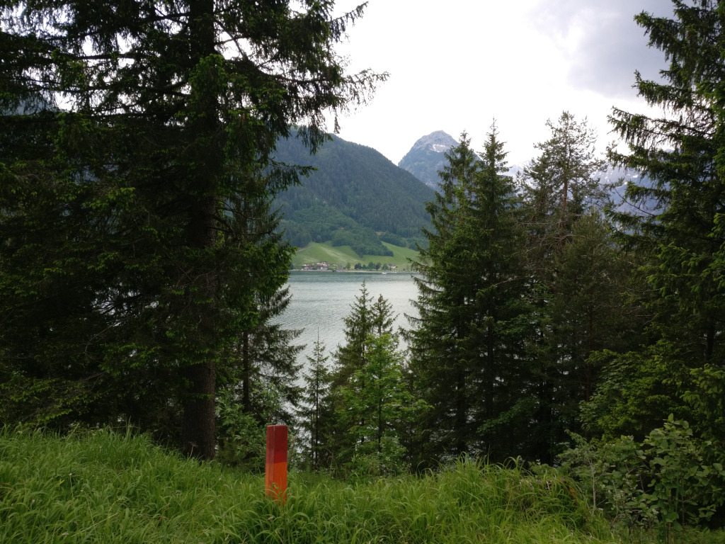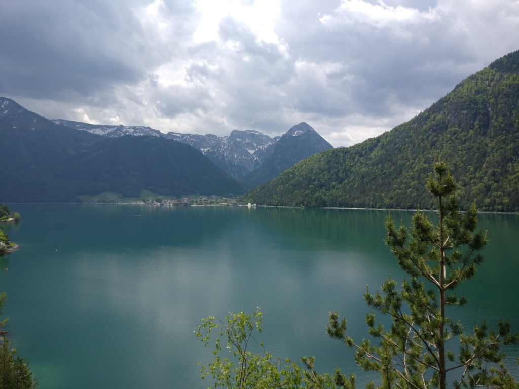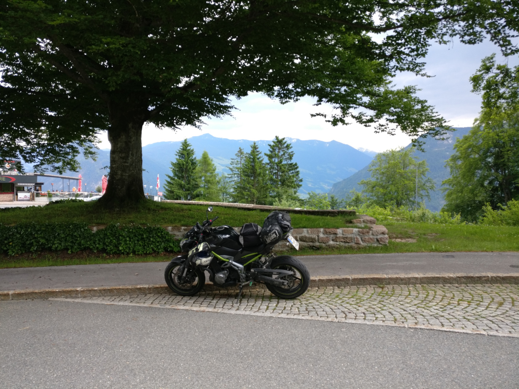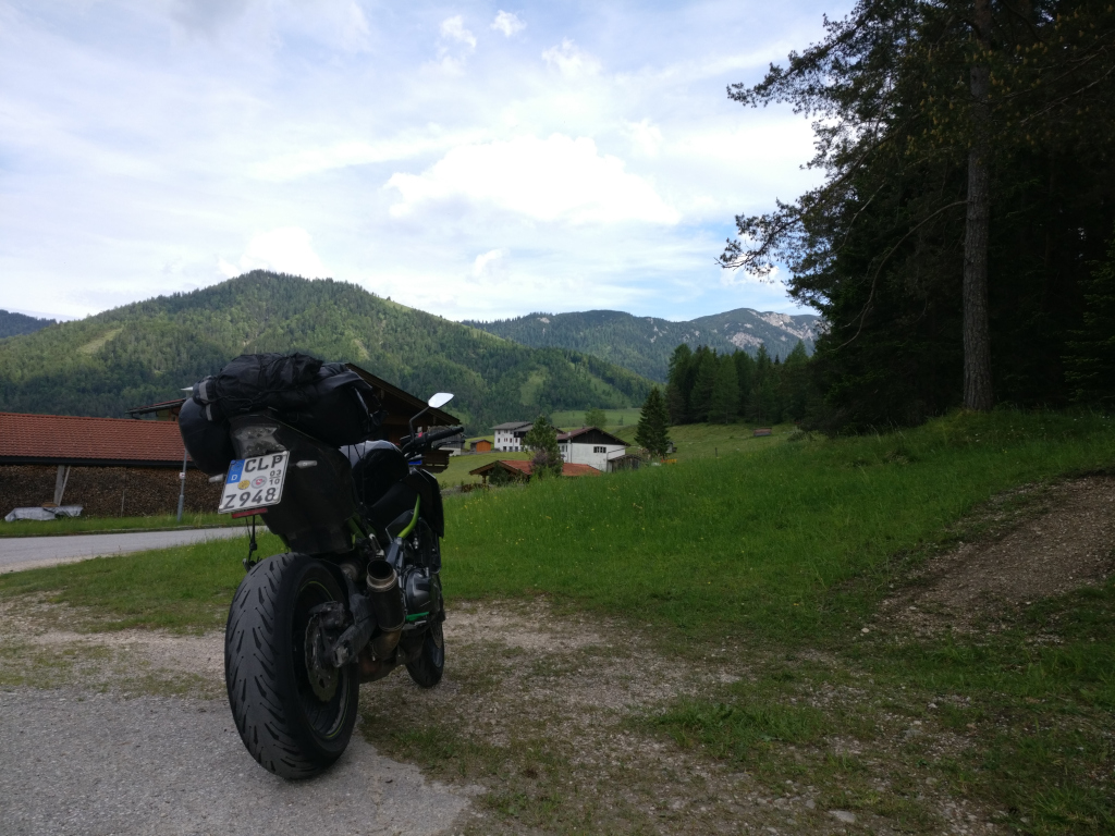 Heute war Rückreisetag, meine Mitbewohner starteten schon um 9 Uhr, damit sie alle rechtzeitig zu Hause sind. Ich ließ es etwas gemütlicher angehen, da ich ja erst um 19:45 Uhr in Innsbruck am Bahnhof sein musste. Somit hab ich dann noch den Geschirrspüler eingeräumt, noch mal geschaut, ob alle Fenster zu sind und sonst alles ok ist. Da kam übers Handy die Nachricht, dass Achim ein Problem mit seinem Tankdeckel hat. Die BMW hat ja ein Keyless-System und da gibt es wohl ab und zu das Phänomen, dass der Deckel sich nicht mehr öffnen lässt. Ich als analoger Tankdeckelöffner habe mich da jeglichen Kommentars enthalten. Aber auf einer der nächsten Touren wird das bestimmt noch thematisiert 😉 . So bin ich dann erst gegen 11 Uhr los. Ich hatte keinen festen Plan und bin also erst mal auf gut Glück losgefahren. Das wäre beinahe zum Problem geworden, weil ich so schöne, kleine Nebenstraßen gefahren bin, dass ich ein wenig den Blick für die Tankanzeige verloren hatte. Plötzlich standen nur noch 45 km Reichweite auf dem Tacho und ich war tief in einem verlassenen Tal. Das Navi errechnet mir dann den Weg zur nächsten Tankstelle – 40 km. Das könnte knapp werden. Also wurde ab jetzt sparsam gefahren. Ich bin dann noch an die Tanke gekommen und habe 16,5 ltr in den 17 ltr-Tank gefüllt. Dann konnte es beruhigt weitergehen. Ich tourte also munter weiter durch die Gegend, und machte mal hier, mal da eine kurze Pause. An der Kanzelkehre kam ein Harleyfahrer aus München auf mich zu und fragte: Was ist das für ein Kennzeichen? Cloppenburg fand er richtig lustig. Wir wechselten noch ein paar Worte, dann fuhr er weiter, laut ‚CLOPPENBURG‘ rufend… Weiter ging es rund um den Achensee, dann ein kleiner Abstecher nach Steinberg am Rofan, der in einer Sackgasse endete, aber sehr schön zu fahren war.