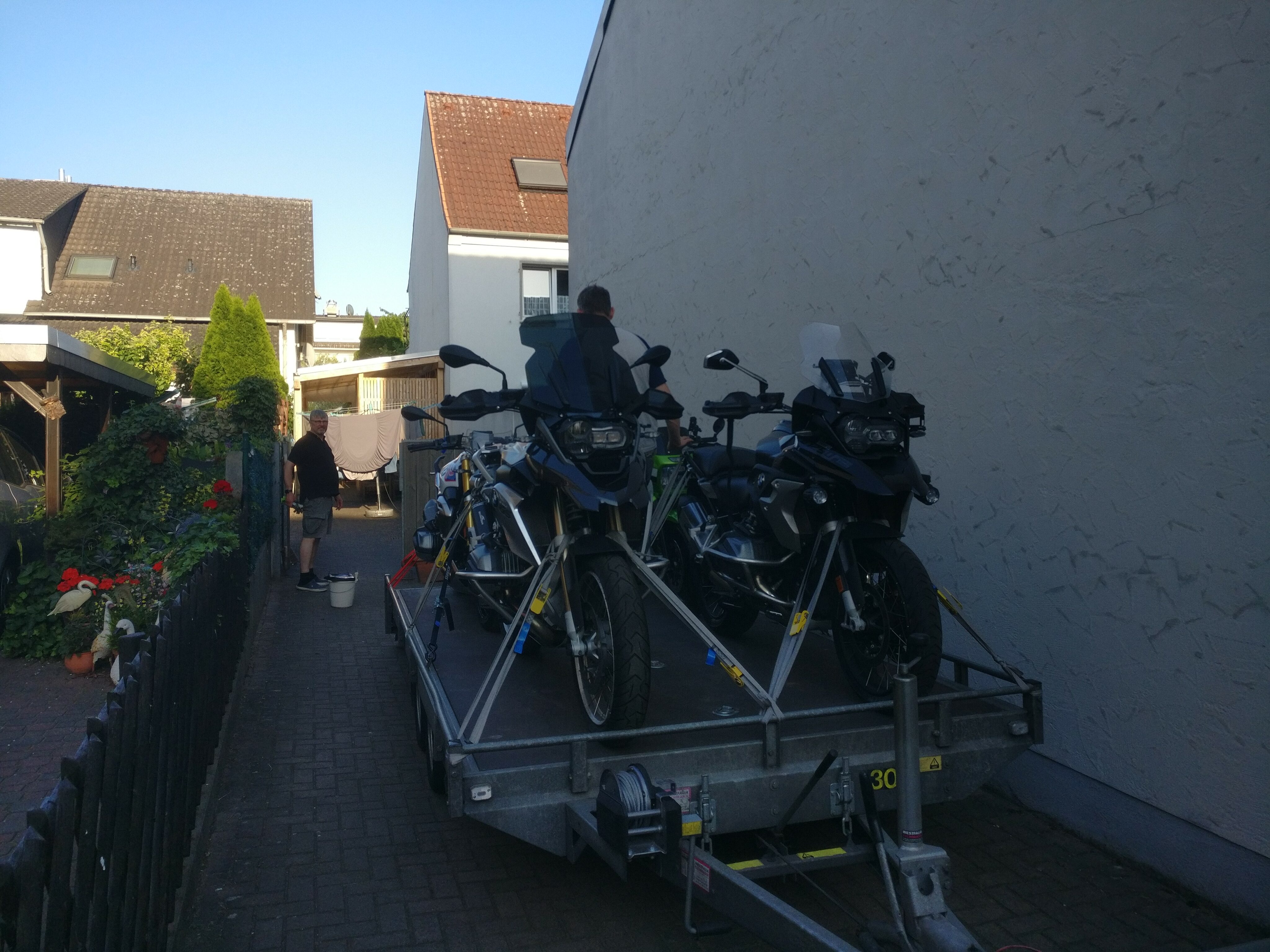 Das Navi prophezeite 6,5 Stunden Fahrtzeit, da ich auf keinen Fall Autobahn fahren wollte. Mit 2 kleinen Pausen saß ich dann heute gute 7 Stunden im Sattel. Anstrengend, aber schön. Es war nicht all zu viel los und so machte das Fahren Spaß. Um so mehr, je weiter ich nach Süden kam. Ich streifte noch mal unsere Melle-Tour vom Pfingstwochenende und nahm auch ein paar schöne Sträßchen im Sauerland mit. Gegen Ende im Großraum Frankfurt wurde es dann ziemlich warm und der Verkehr nahm auch so stark zu, dass ich froh war, in Maintal anzukommen. Kurze Zeit später trafen auch Matze und Achim ein und wir verluden die 4 Mopeds auf den Hänger, damit wir morgen früh beizeiten starten können.