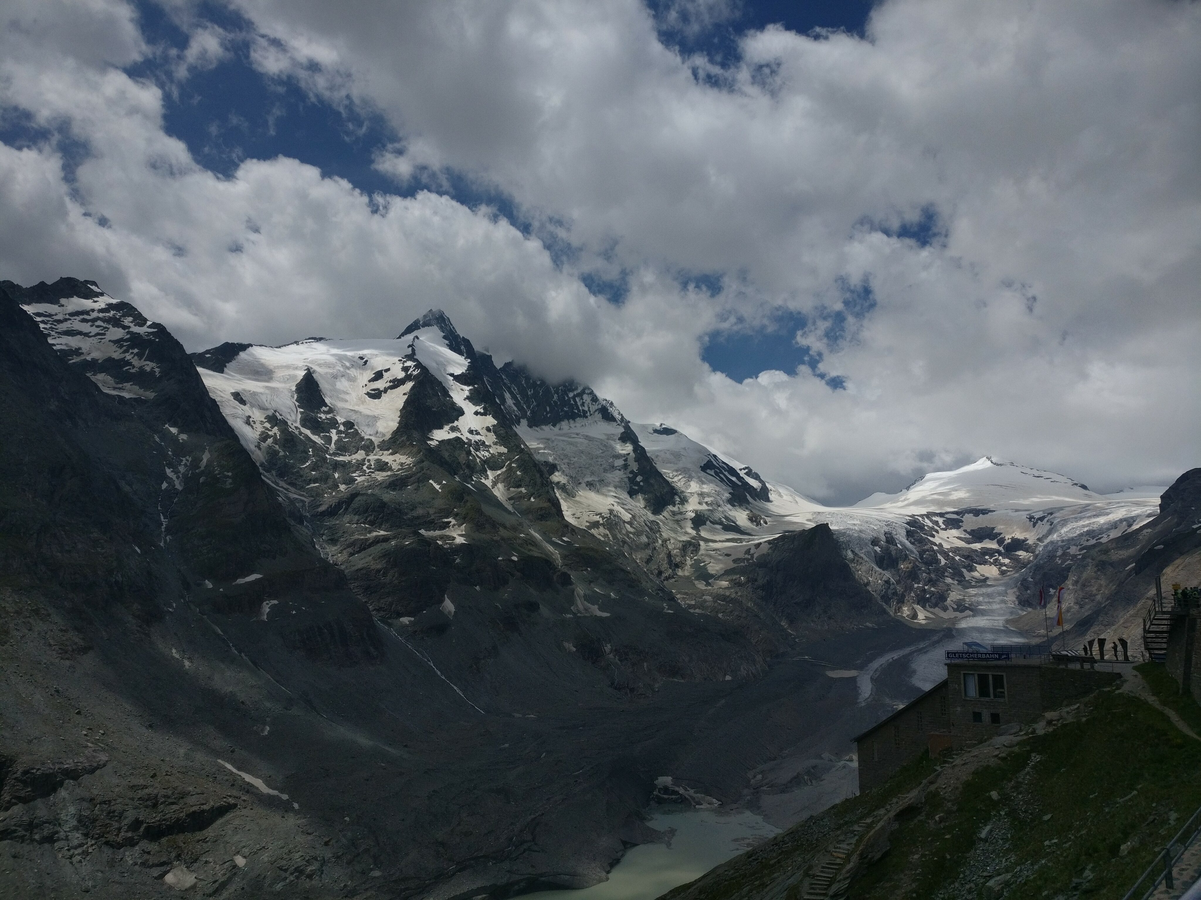 Auf dem Großglockner angekommen, war ich allerdings nicht ganz so begeistert, was in erster Linie an der Riesenmenge Menschen lag, die alle dasselbe Ziel wie wir hatten. Hunderte von Mopedfahrern drängten sich auf dem Parkplatz, zusätzlich jede Menge Autos, Radfahrer, andere Touristen und wir 4 dann auch noch. So machten wir nur ein obligatorisches Foto…