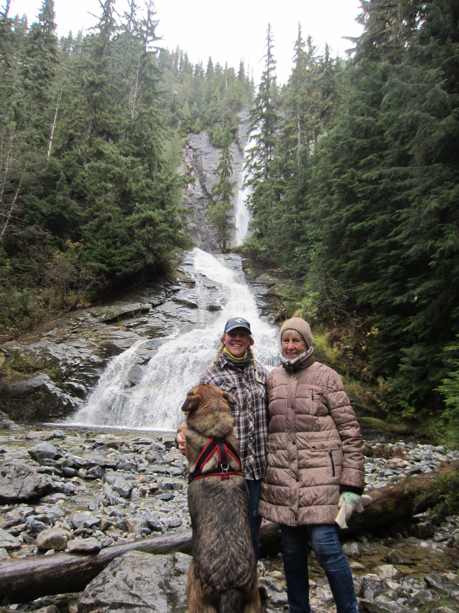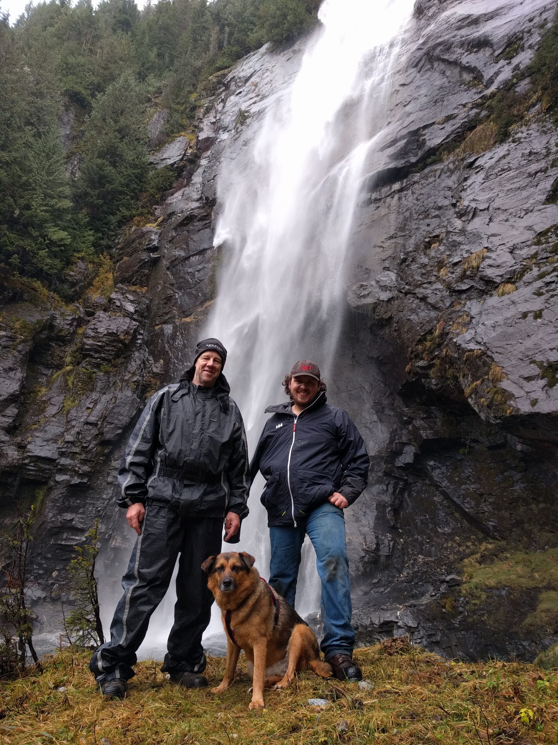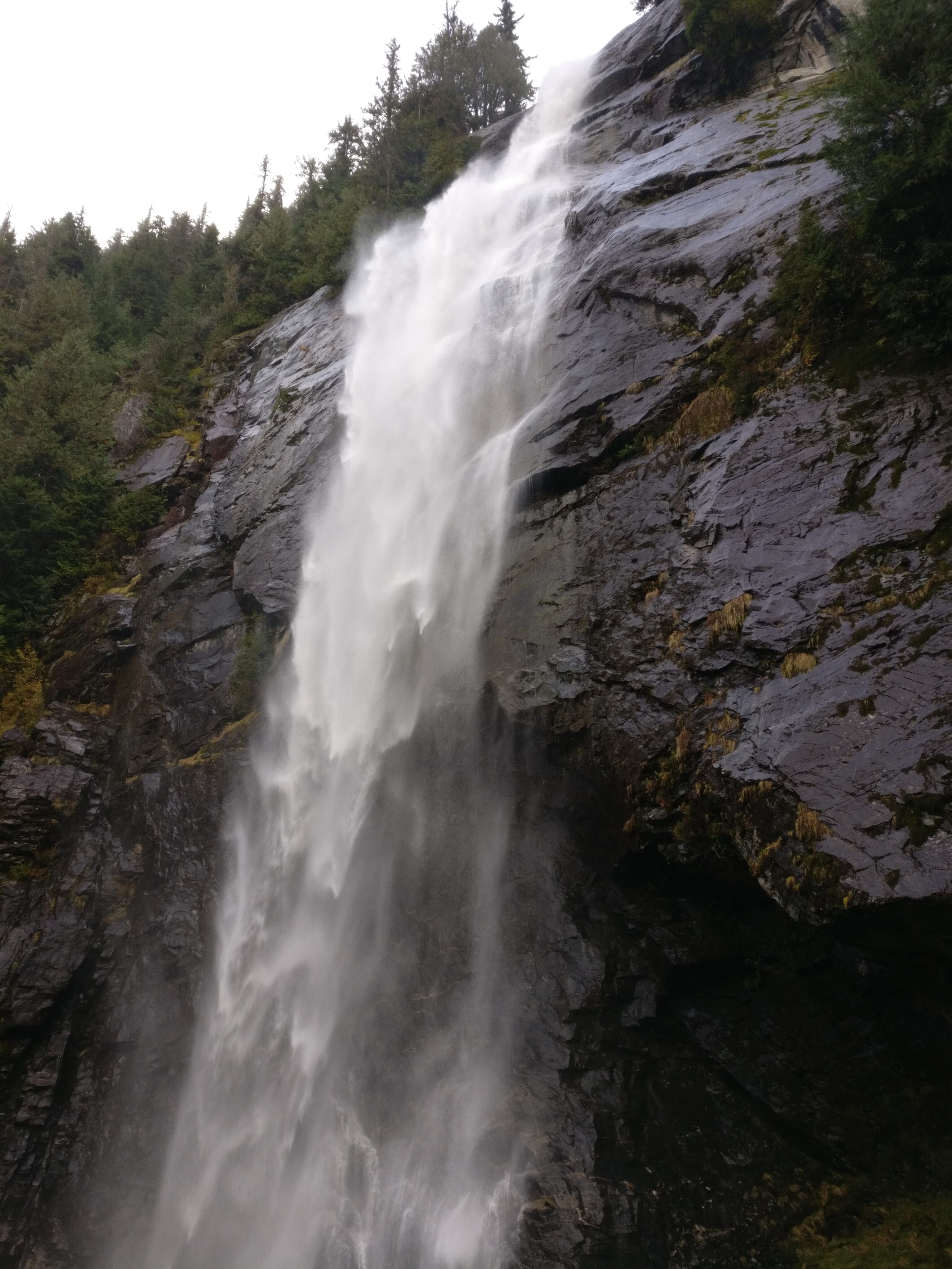 Nachdem sie sich gründlich ausgetobt hatten, setzten wir unseren Weg fort zum Exstew Wasserfall. Ein kurzer Fußmarsch führte uns an das Basisbecken dieses gewaltigen Naturerlebnisses. Aus 76 m Höhe stürzten die Wassermassen steil herab und umnebelten uns mit feinsten Tröpfchen. Das war der große Bruder vom gestrigen Wasserfall im Giant Spruce Park.