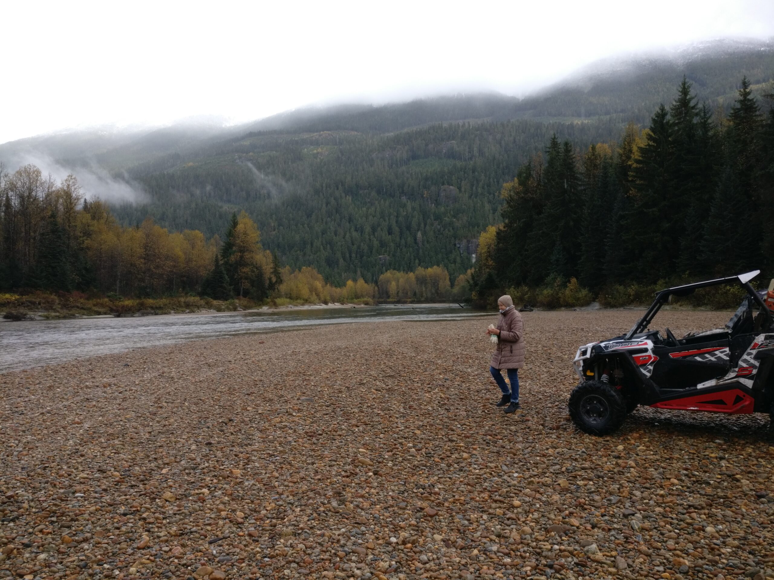SXS are open all around and have only a small square fixed roof. While there was a windshield in the second vehicle, ours was only half-height. The driving wind flew around my ears from all sides. Suddenly I was glad I had a sturdy crash helmet on my head. Blake turned a knob. Shortly after, warm air rushed to my feet. What a relief! I gave him a grateful look, and he raised his thumb with a grin. The road, which was only stony at first, now became increasingly uneven. We drove through ditches, over tree roots and trunks, over stones and boulders and were thoroughly shaken. At times we got into such an inclined position that I expected to tip over in the next moment. Now I realized why the SXS has all-wheel drive and all four wheels are individually suspended. It was an incredibly wild ride. It wasn’t until we stopped on the rocky banks of the Exstew River that I was able to breathe normally again and let the tension out of my body a bit.