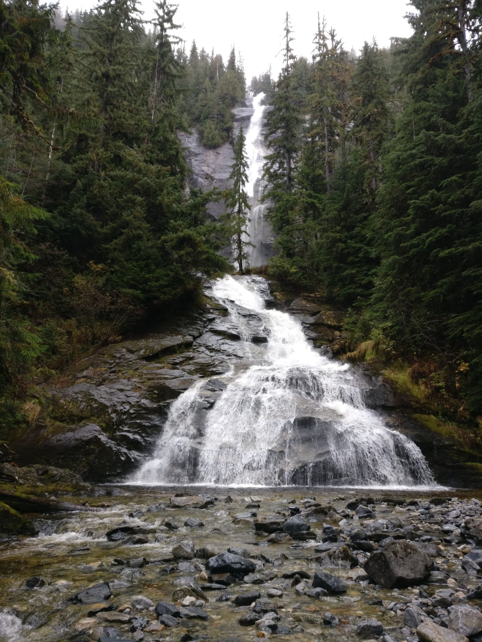 Nachdem sie sich gründlich ausgetobt hatten, setzten wir unseren Weg fort zum Exstew Wasserfall. Ein kurzer Fußmarsch führte uns an das Basisbecken dieses gewaltigen Naturerlebnisses. Aus 76 m Höhe stürzten die Wassermassen steil herab und umnebelten uns mit feinsten Tröpfchen. Das war der große Bruder vom gestrigen Wasserfall im Giant Spruce Park.