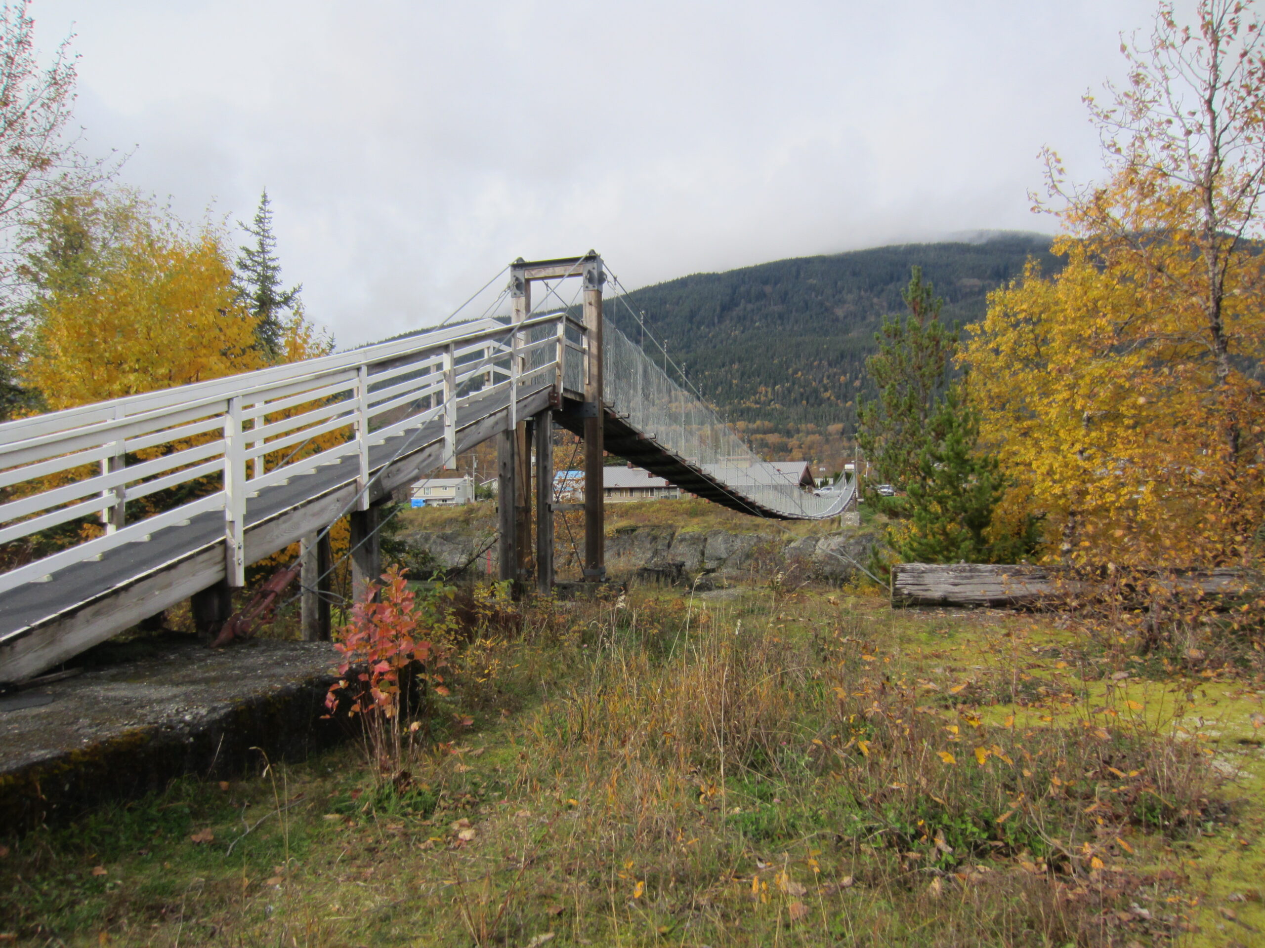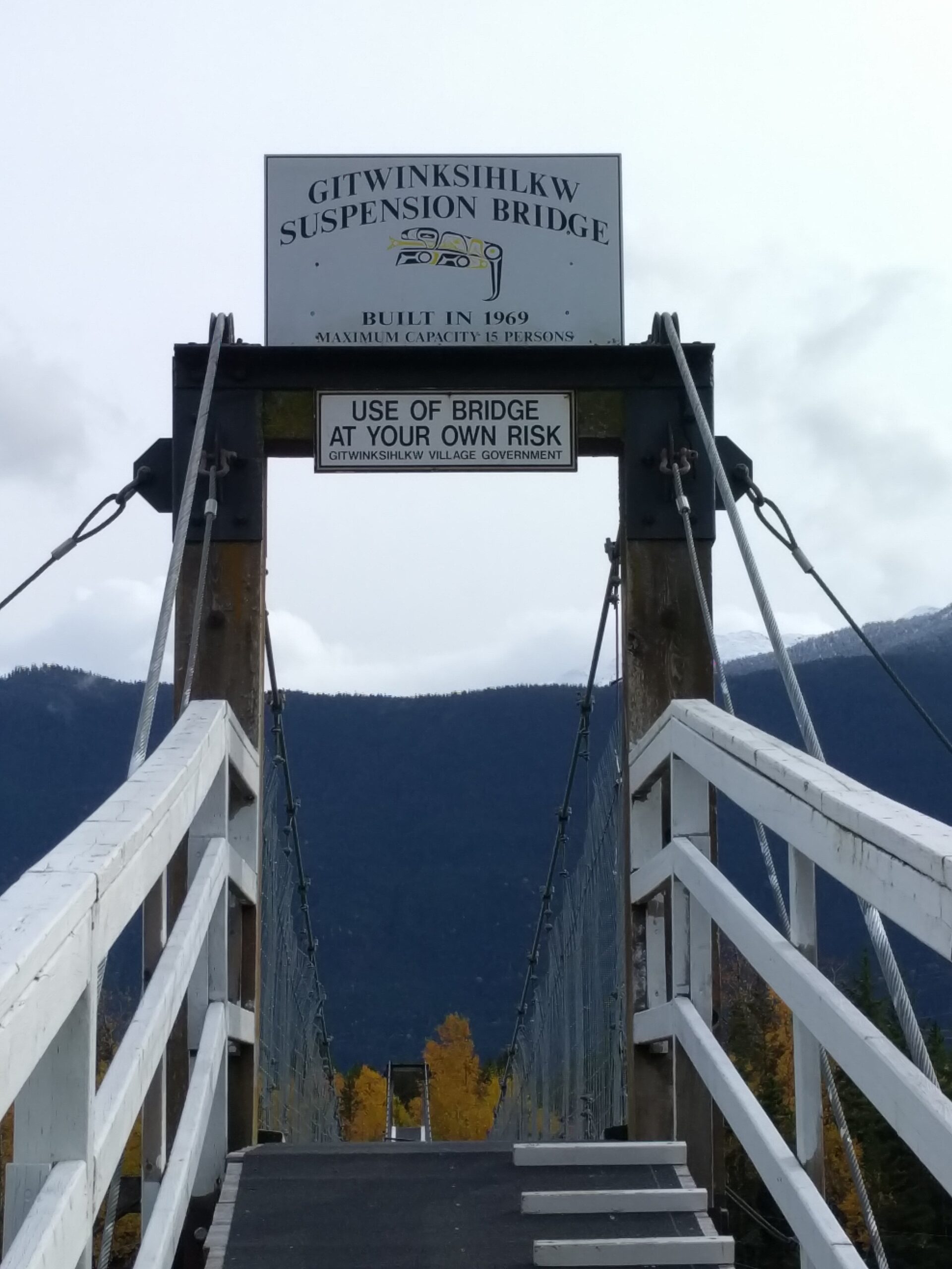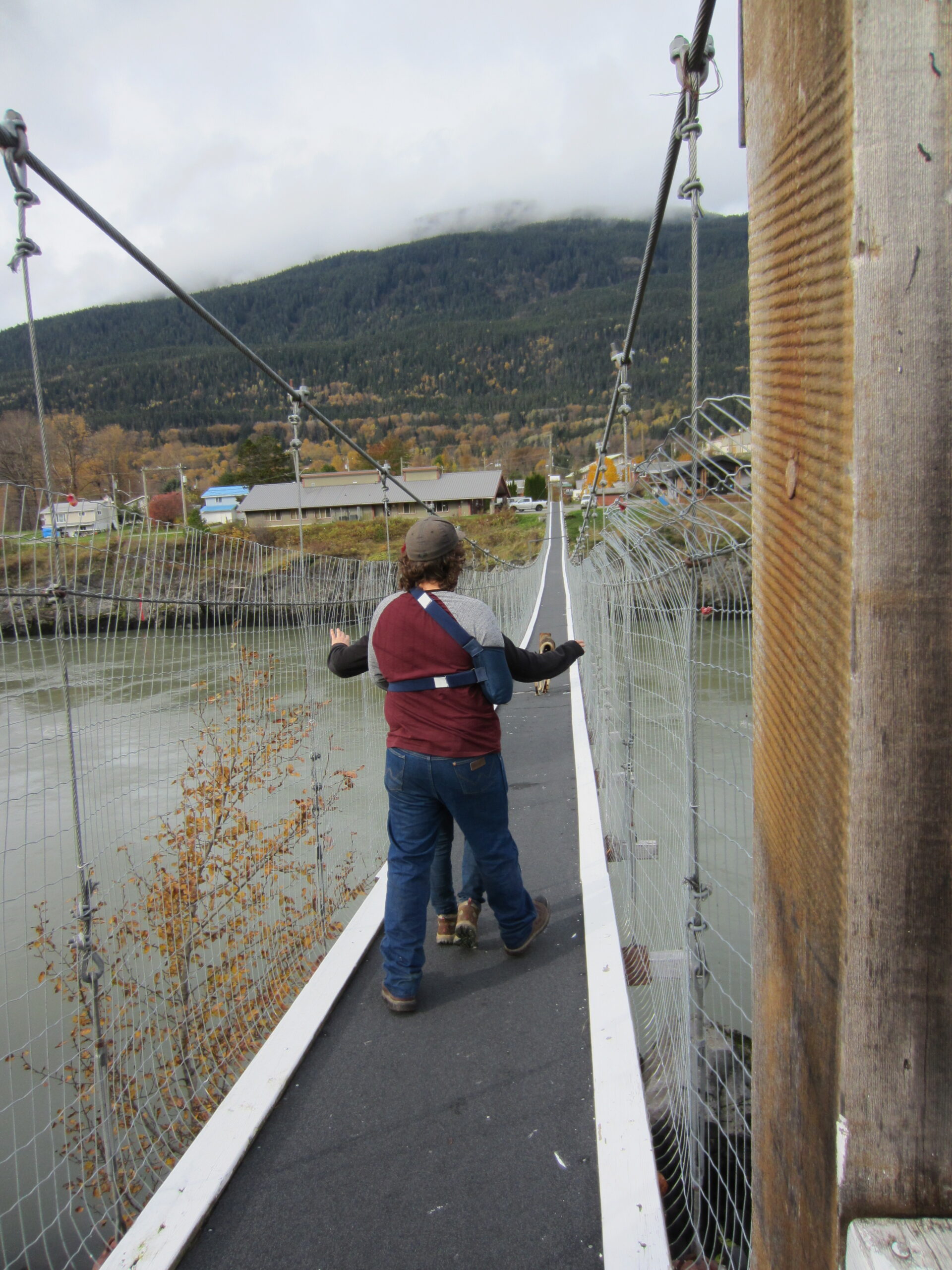 We continued on to Gitwinksihlkw to the Suspension Bridge, a suspension bridge built in 1969, only one meter wide and a good 100 meters long, over the Nass River. I felt like I was on the high seas when we crossed the river on it. We began to lurch a lot, and only Alaska thought it was totally normal.