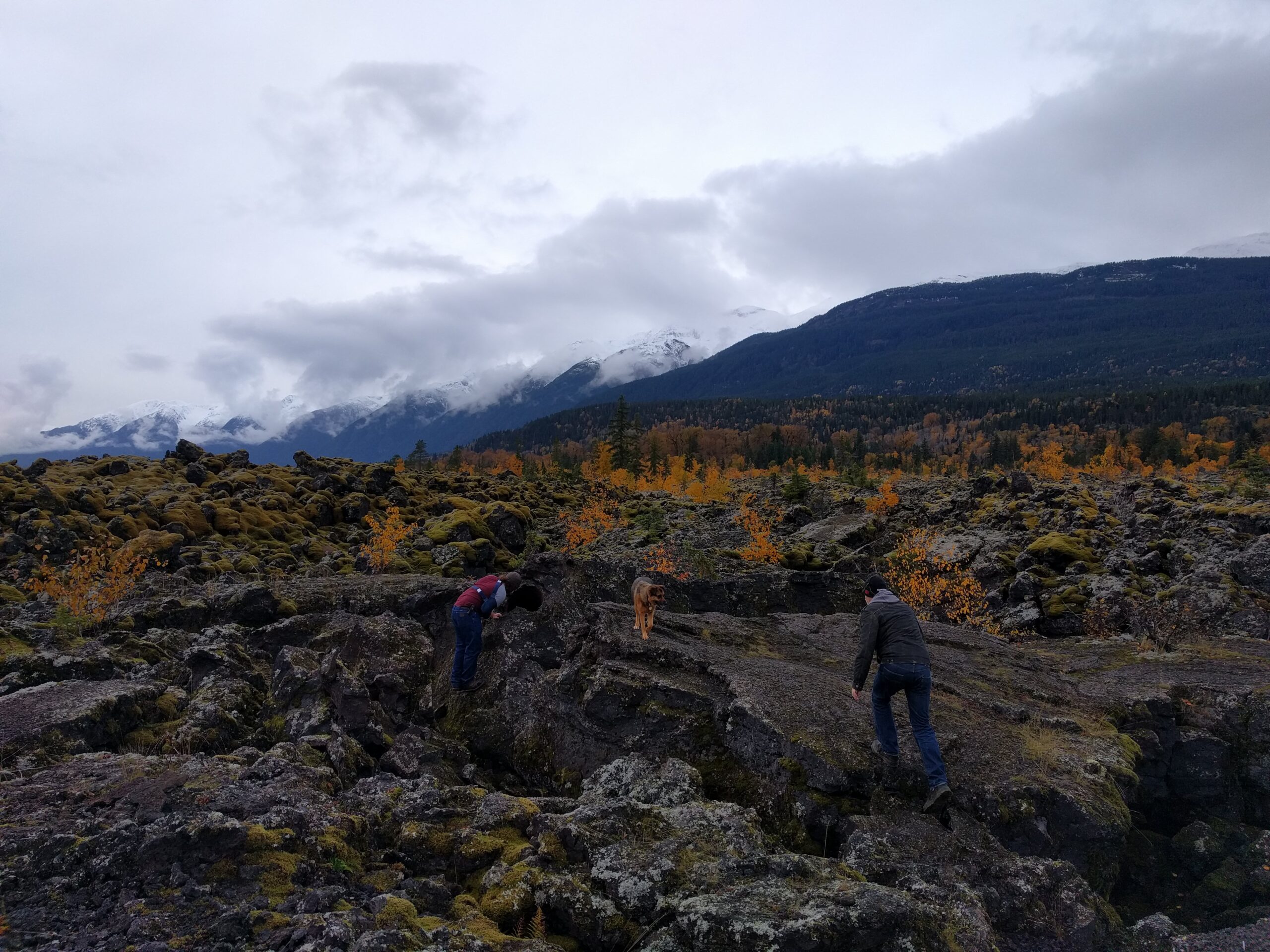 Wenig später hatten wir Gelegenheit das ganze Ausmaß dieser Zerstörung zu sehen. Ein riesiges Lavafeld bot einen irrationalen Anblick. Teilweise von Moos und Flechten überzogene vulkanische Formationen bedeckten eine unübersehbare Fläche: Röhren, Kämme, Krater, Spalten bis zu 12 m tief. Wir mussten höllisch aufpassen, um nicht irgendwo hineinzustürzen, abzurutschen oder steckenzubleiben, für Alaska allerdings wieder ein Riesenspaß.