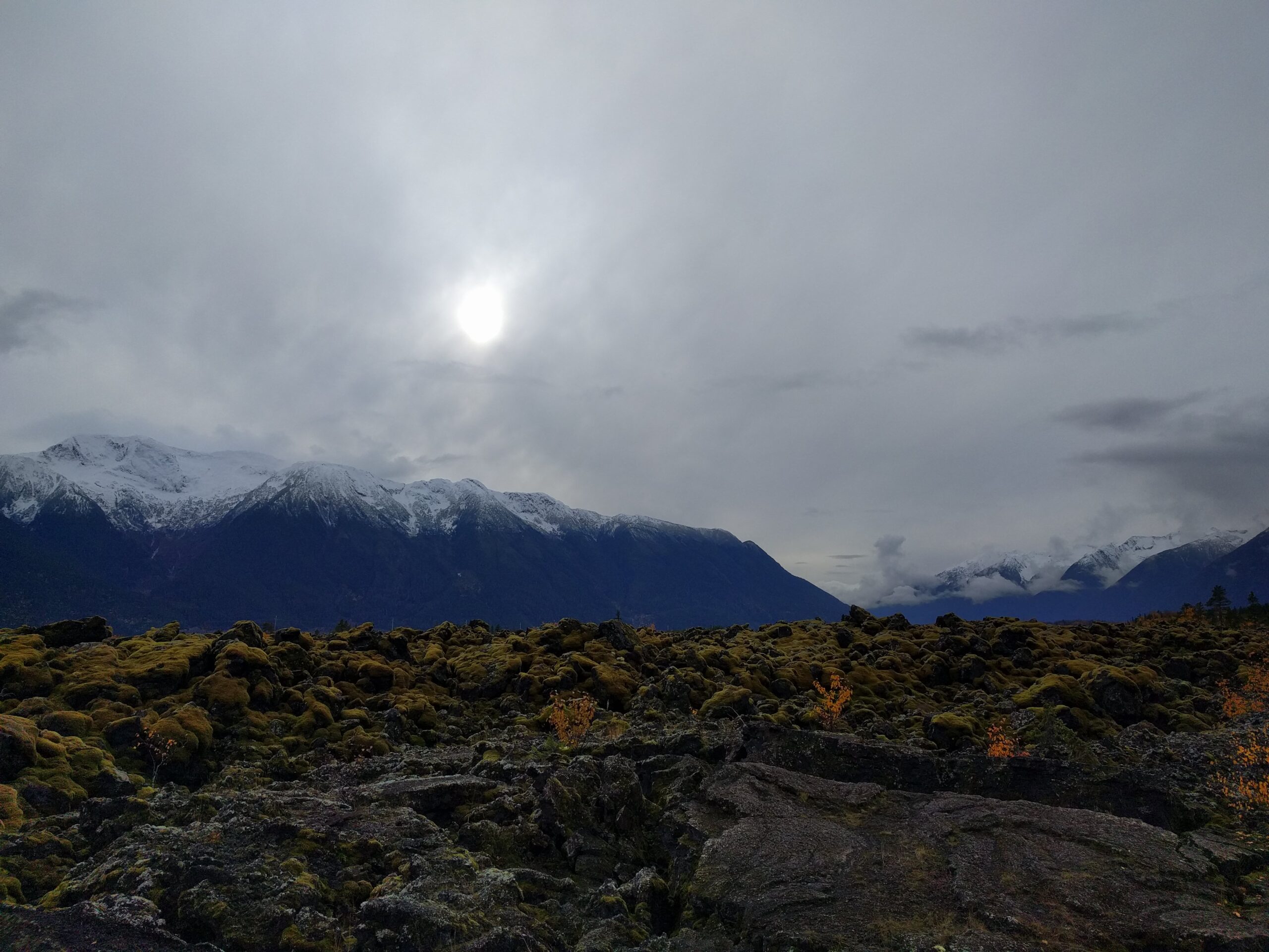 A little later we had the opportunity to see the full extent of this destruction. A huge lava field presented an irrational sight. Partially covered by moss and lichen, volcanic formations covered an unmissable area: tubes, ridges, craters, fissures up to 12 meters deep. We had to watch out like hell not to fall in somewhere, slip off or get stuck, but for Alaska again a lot of fun.