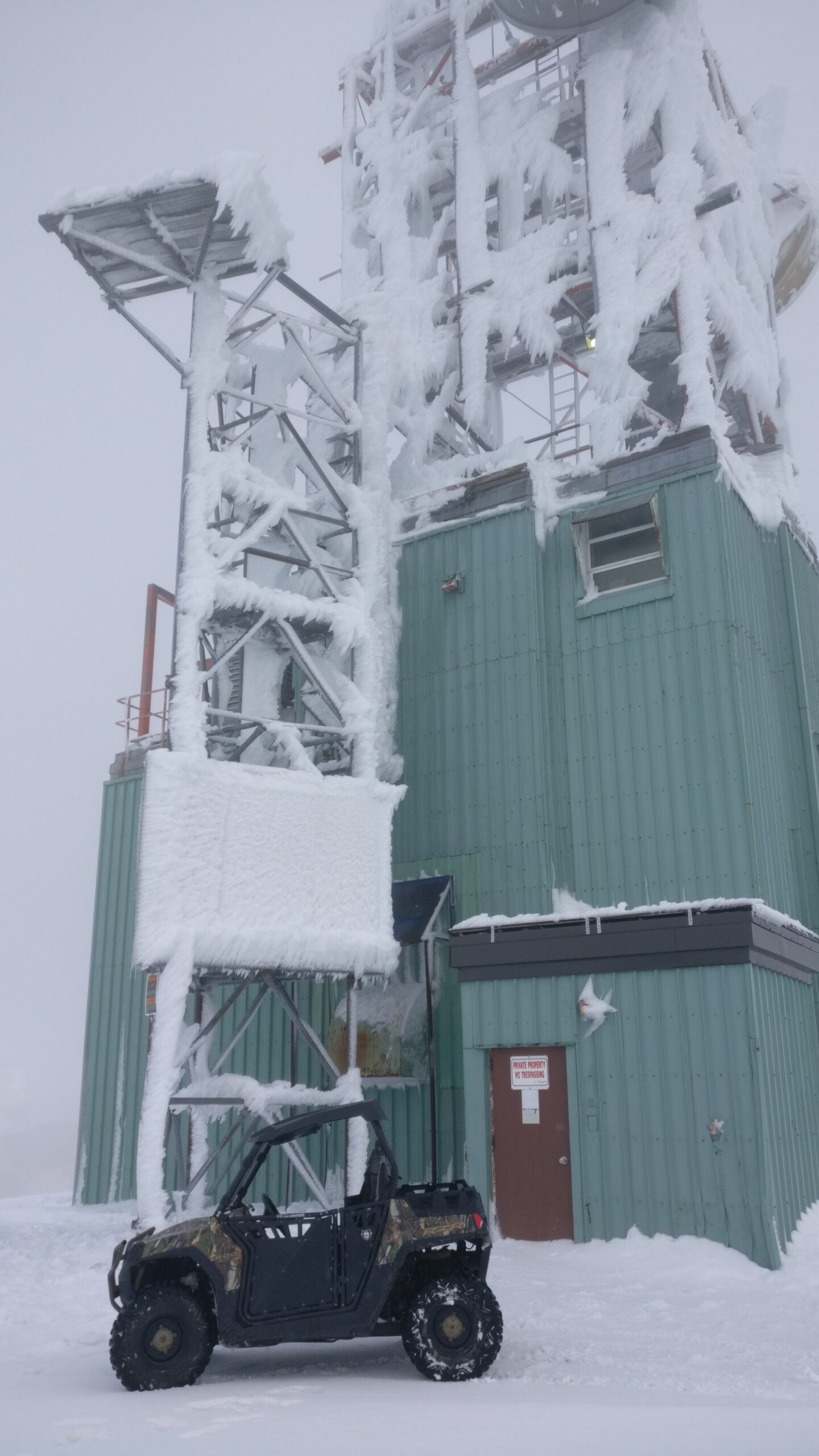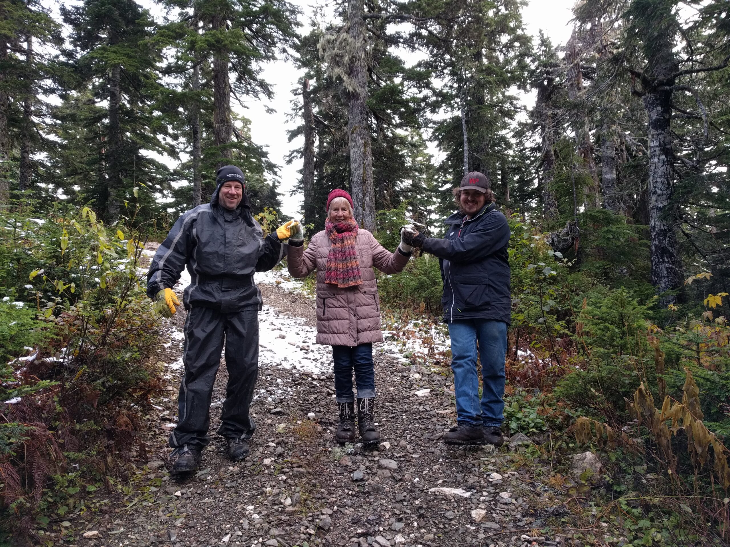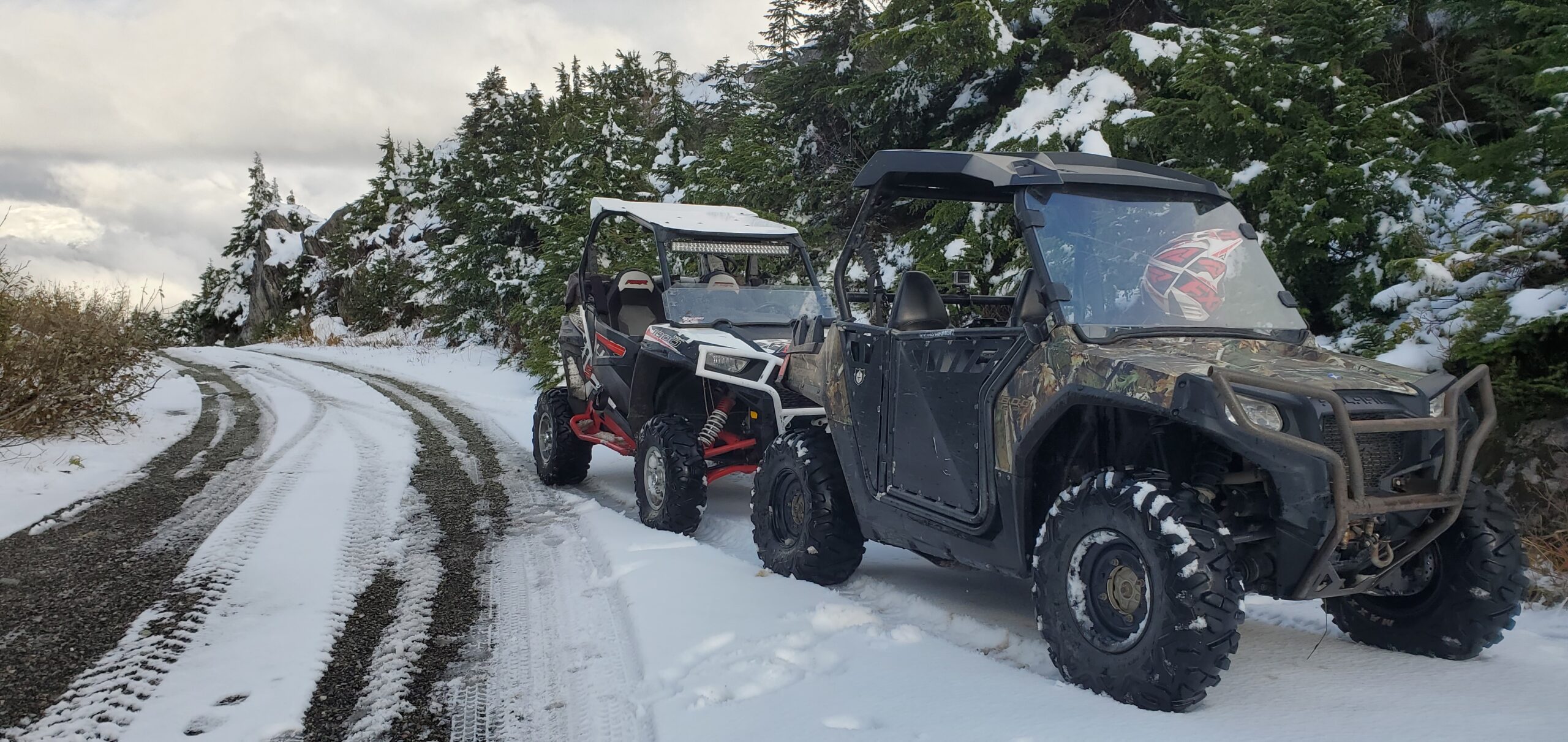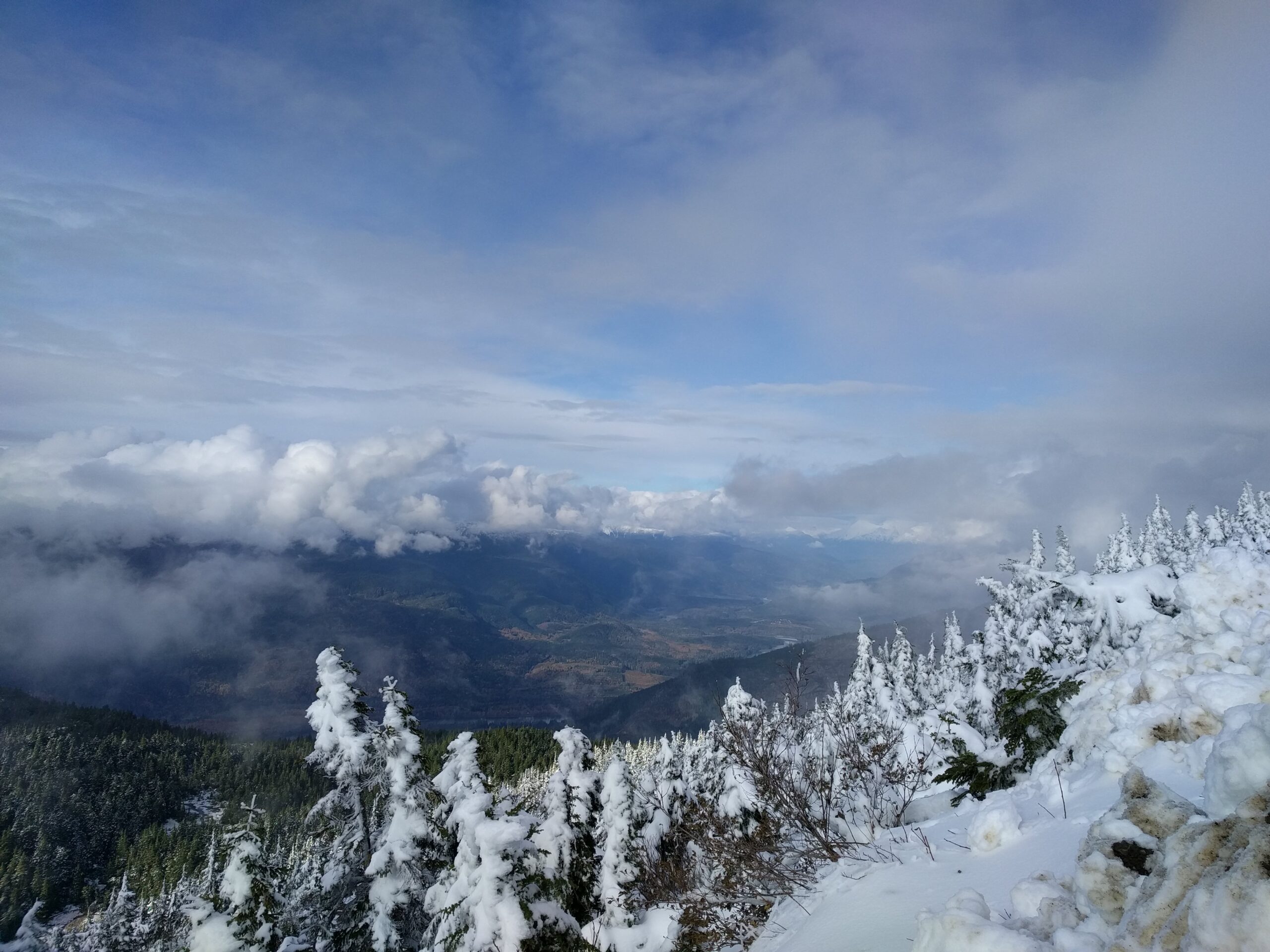 „Your favourite“ lachte mein Enkelkind, und damit war klar: eine erneute Tour mit den SXS. Thornhill Mountain war das Ziel. Zwischen schroff aufragenden und auf der anderen Seite ebenso steil abfallenden Felswänden ging die Fahrt auf rauen Schotterwegen bergaufwärts. Äußerste Vorsicht war geboten, denn es galt große Felsbrocken, Washouts, enge Serpentinen, große Schlaglöcher sowie exponierte Baumwurzeln zu überwinden. Als wir die Schneegrenze passiert hatten, konnten wir manche Steigungen nur nach mehrmaligen Anläufen und dann im Slalom meistern. Schnee stiebte von allen Seiten auf uns ein. Wir befanden uns buchstäblich in einem weißen Inferno. Völlig mit Schnee überschüttet kroch ich oben angekommen aus dem SXS, und Blake lachte nur. Ich schaute mich um. Der Himmel öffnete sich. Ein Panoramablick ermöglichte kilometerweite Sicht in alle Richtungen: das gesamte Skeena Valley mit seinen bunten Wäldern, Terrace und der Lakelse Lake lagen unter uns. Die schwache Wintersonne beleuchtete die gesamte Szenerie. Unglaublich schöne Wolkenformationen zogen darüber hinweg. Alle Bäume, Büsche, Felsen und sogar die Fernmeldetürme auf der Spitze des Thornhill Mountain waren bizarr dick mit gefrorenem Schnee überzogen. Wir kamen aus dem Staunen nicht heraus.