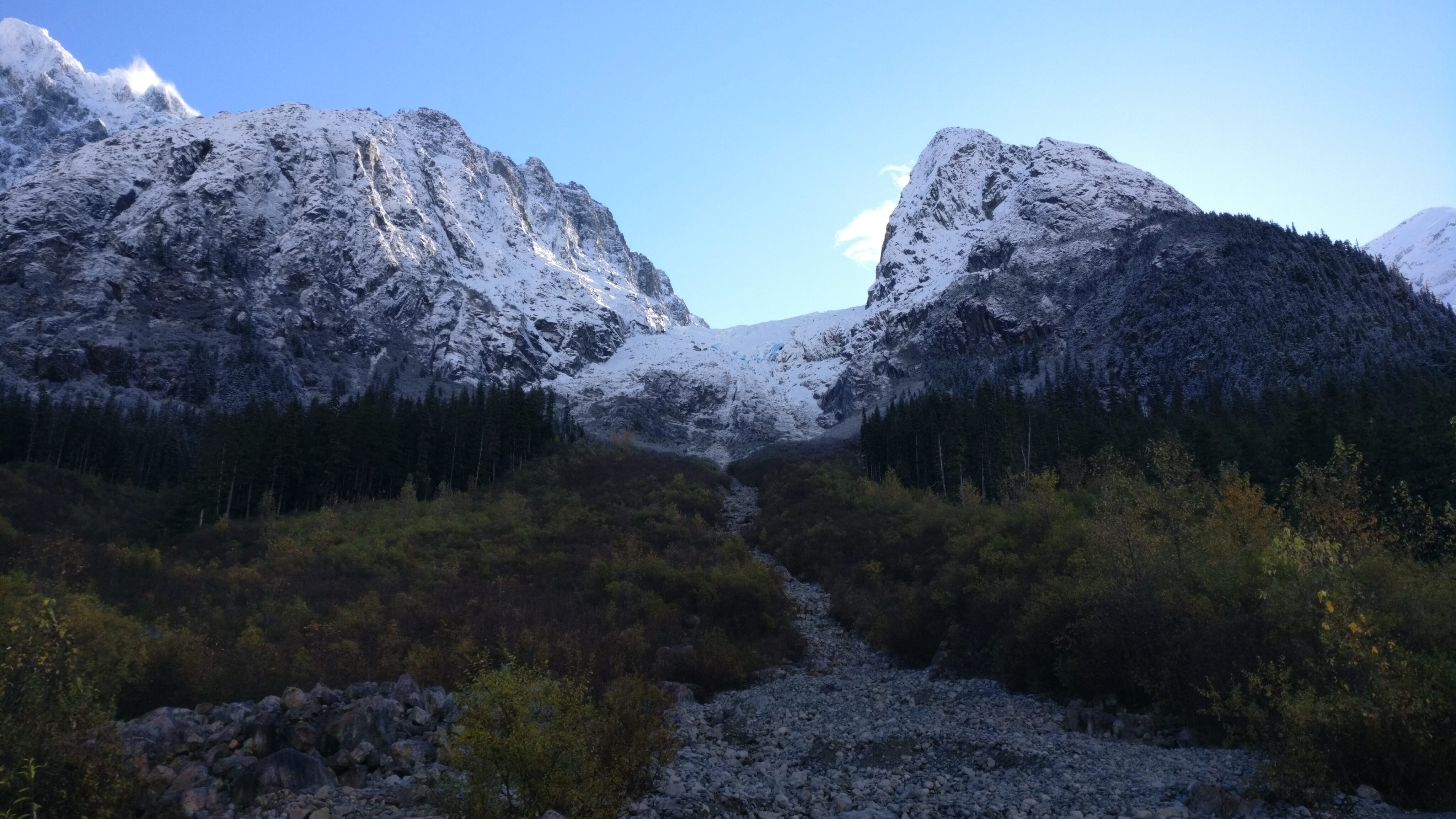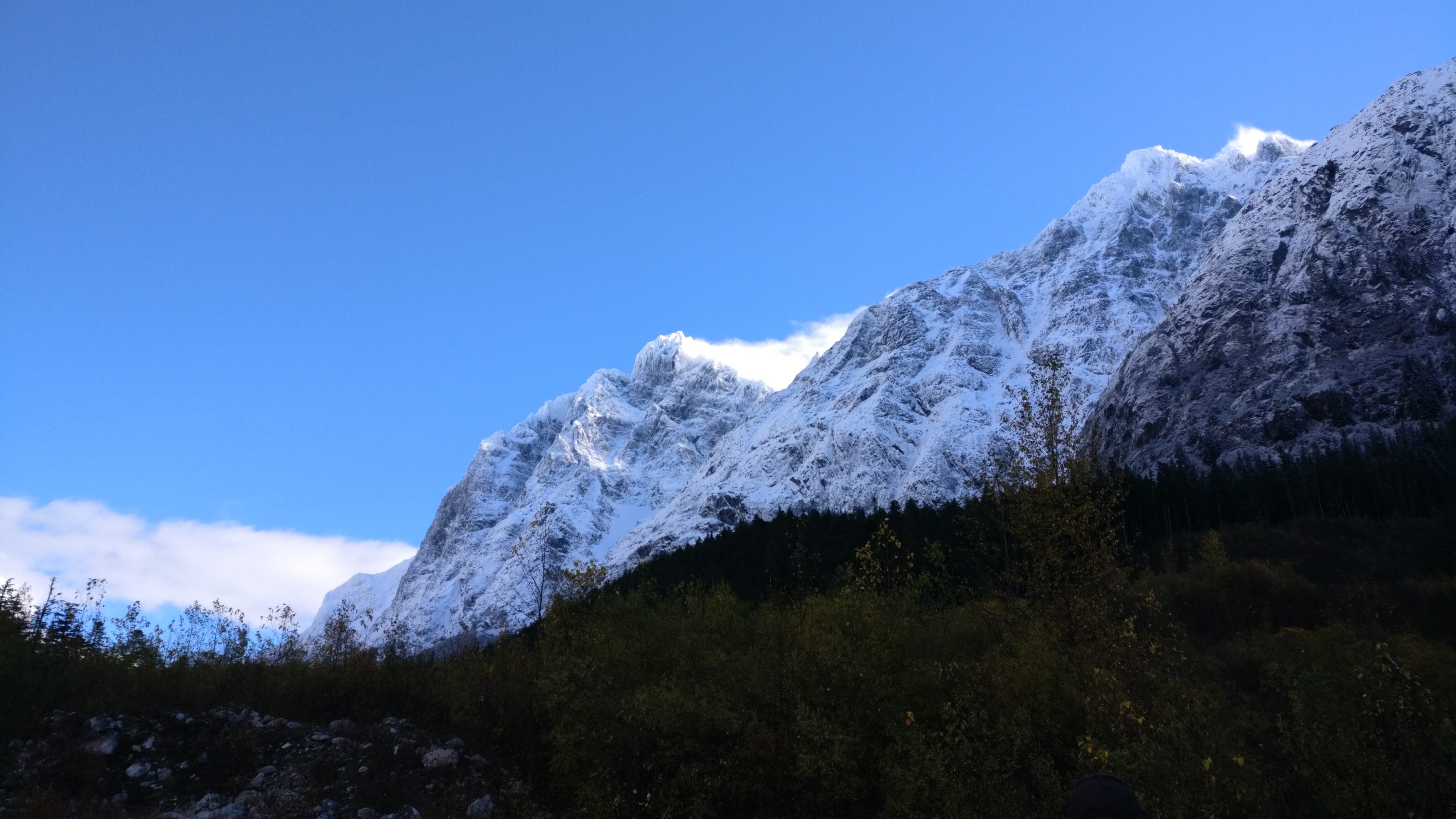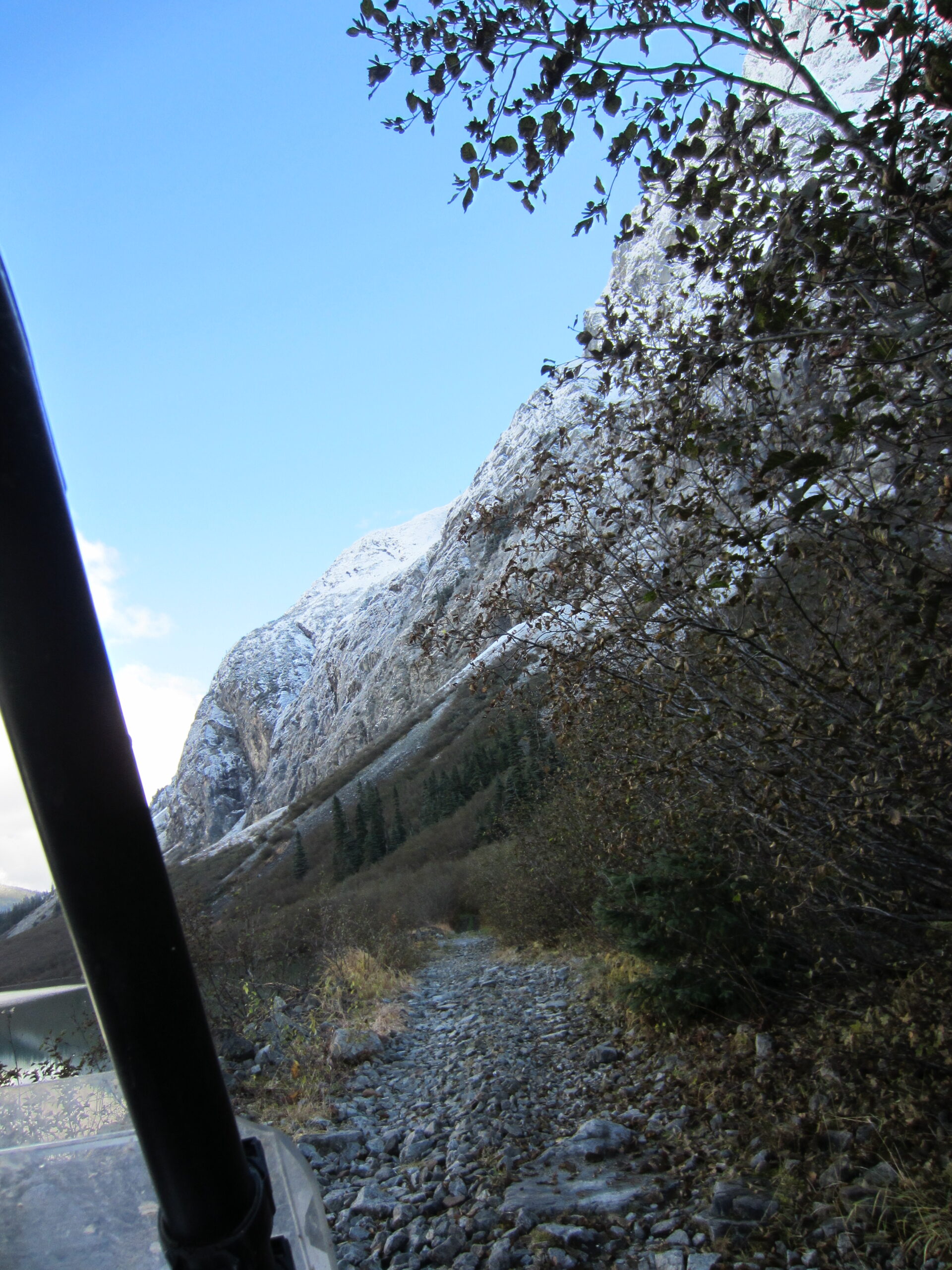 Nun ging es zunächst durch schönen Wald mit herrlichen Aussichtspunkten auf die umliegenden dunklen Berge, deren schneebedeckte Spitzen sich klar vom tiefblauen wolkenlosen Himmel abhoben. Doch schon bald änderte sich der Untergrund. Es schien, als seien zerbrochene Berge über unseren Weg geschüttet worden. Das vergletscherte, oftmals von Wasser überspülte Gelände zwischen steil aufragenden Felsriesen verlangte höchste Aufmerksamkeit und machte das Fahren über die aus einer Mischung aus losem Schmutz und Felsbrocken bestehende Piste äußerst schwierig.
