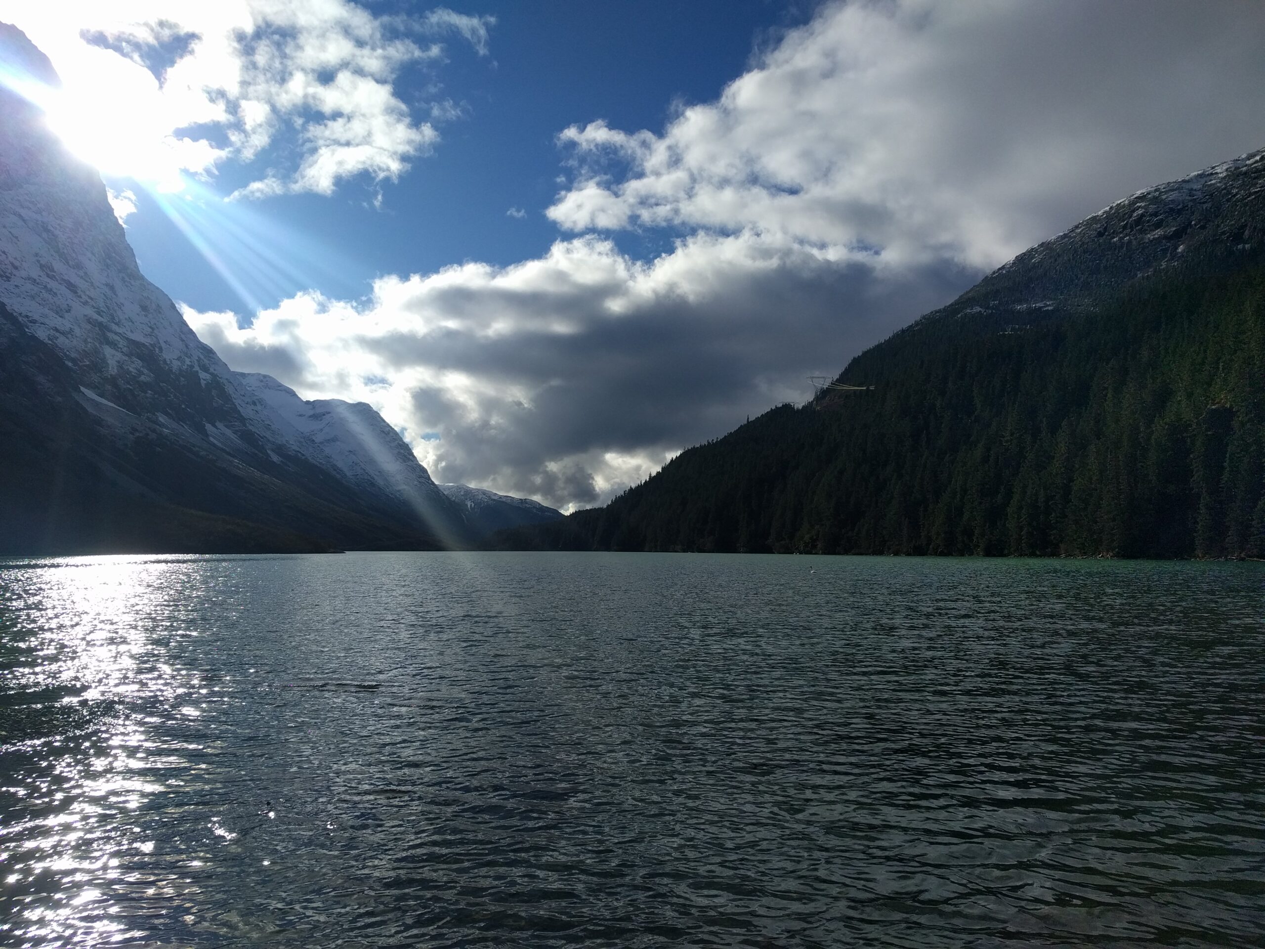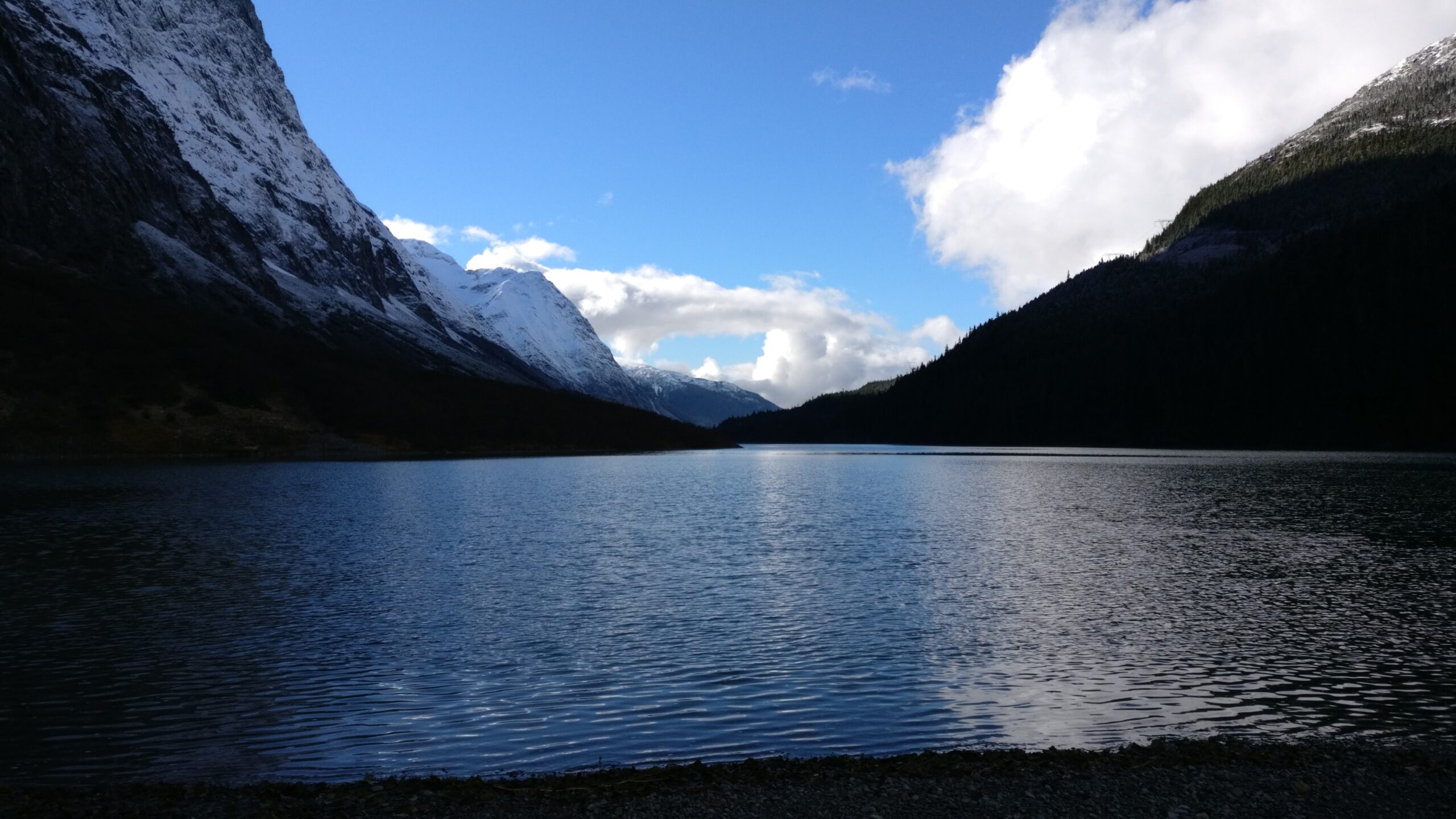 When we were satiated, we had leisure again to admire the indescribably beautiful surroundings. The afternoon sun was still hiding behind a mountain, and we waited for it to emerge and pour its bright rays over the forests and mountains on the opposite side of the lake, making the lake glisten silvery.