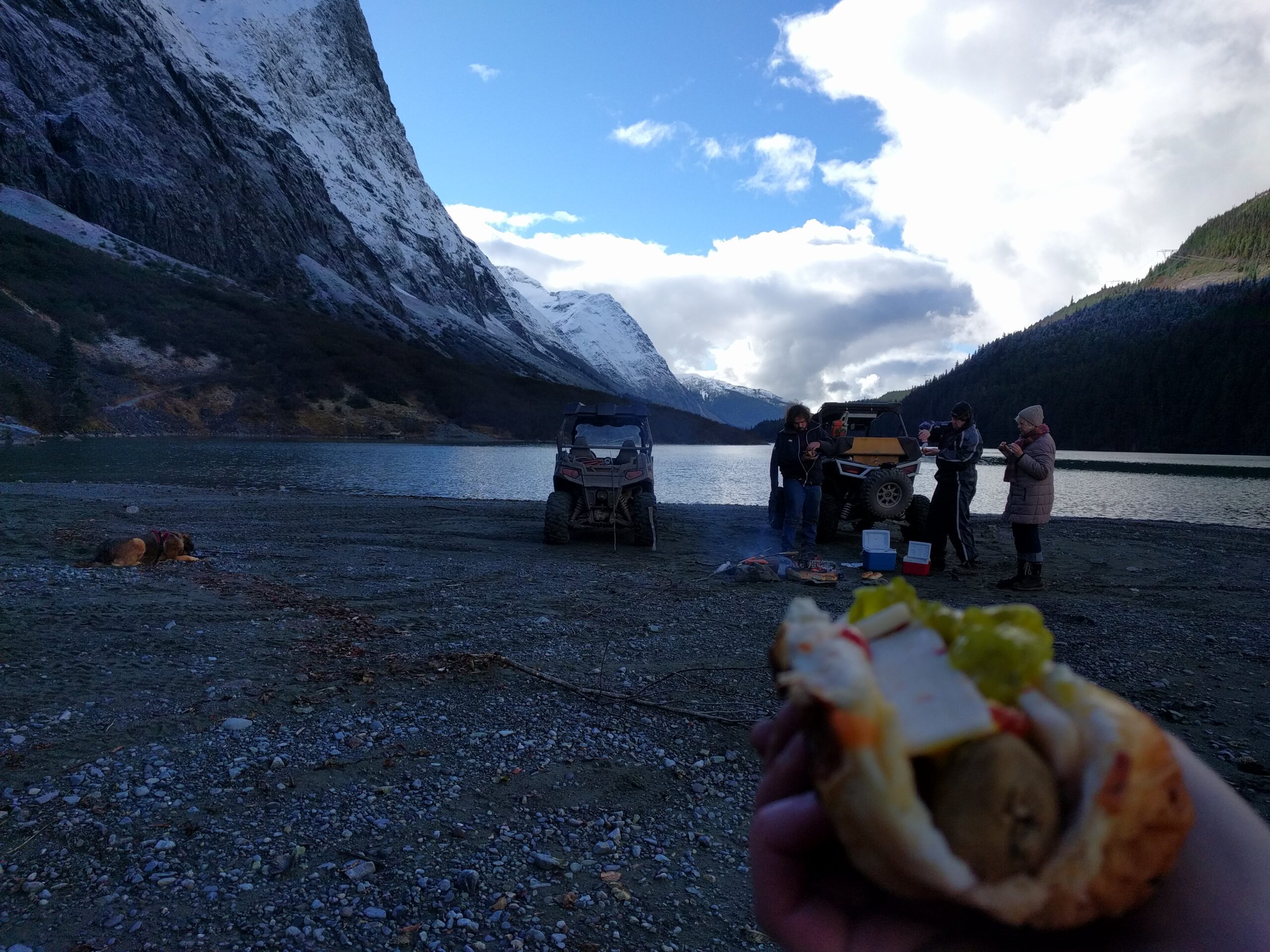 I was prepared for everything and should not be disappointed. In the morning again the usual loading of the two SXS. In addition, lots of wood was stowed, and Lea packed a large picnic bag. „Today we’re driving the Telkwa Pass,“ Blake proudly announced, his eyes flashing with enterprise. The truck ride up to the actual start of the pass was unspectacular. On the way we had the opportunity to look for fossils in an area of shale rocks and boulders. We even found some. I was able to take several shells embedded in stone as souvenirs.
