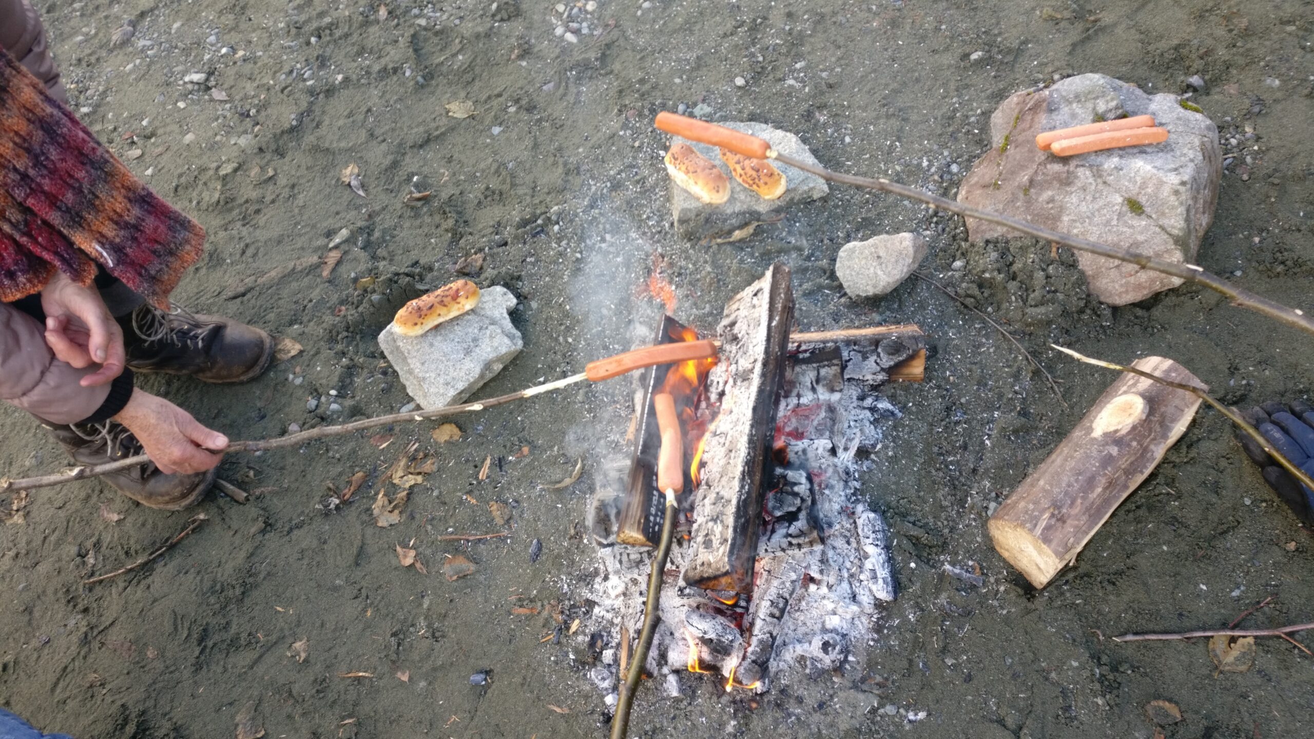 Blake immediately began to unload the thick logs and chop them with the axe, mind you everything exclusively with the left hand. Lea readied the picnic bag. Soon a bright fire was blazing and spreading pleasant warmth, if only one stood close enough. Sticks were cut and sharpened from the surrounding bushes, and soon all four of us were standing around the fire with our skewered hot dog sausages, letting them sizzle. Lea had packed everything that goes with this hearty snack: mayonnaise, ketchup, pickles, cheese slices, and the spicy barbecue sauce, not to mention the soft buns that all the deliciousness was wrapped in. Aaahhh! What a treat that was! A hearty canned beer was also served, and the mood was already splendid. Of course, Laski also got her share. Everyone was completely satisfied.