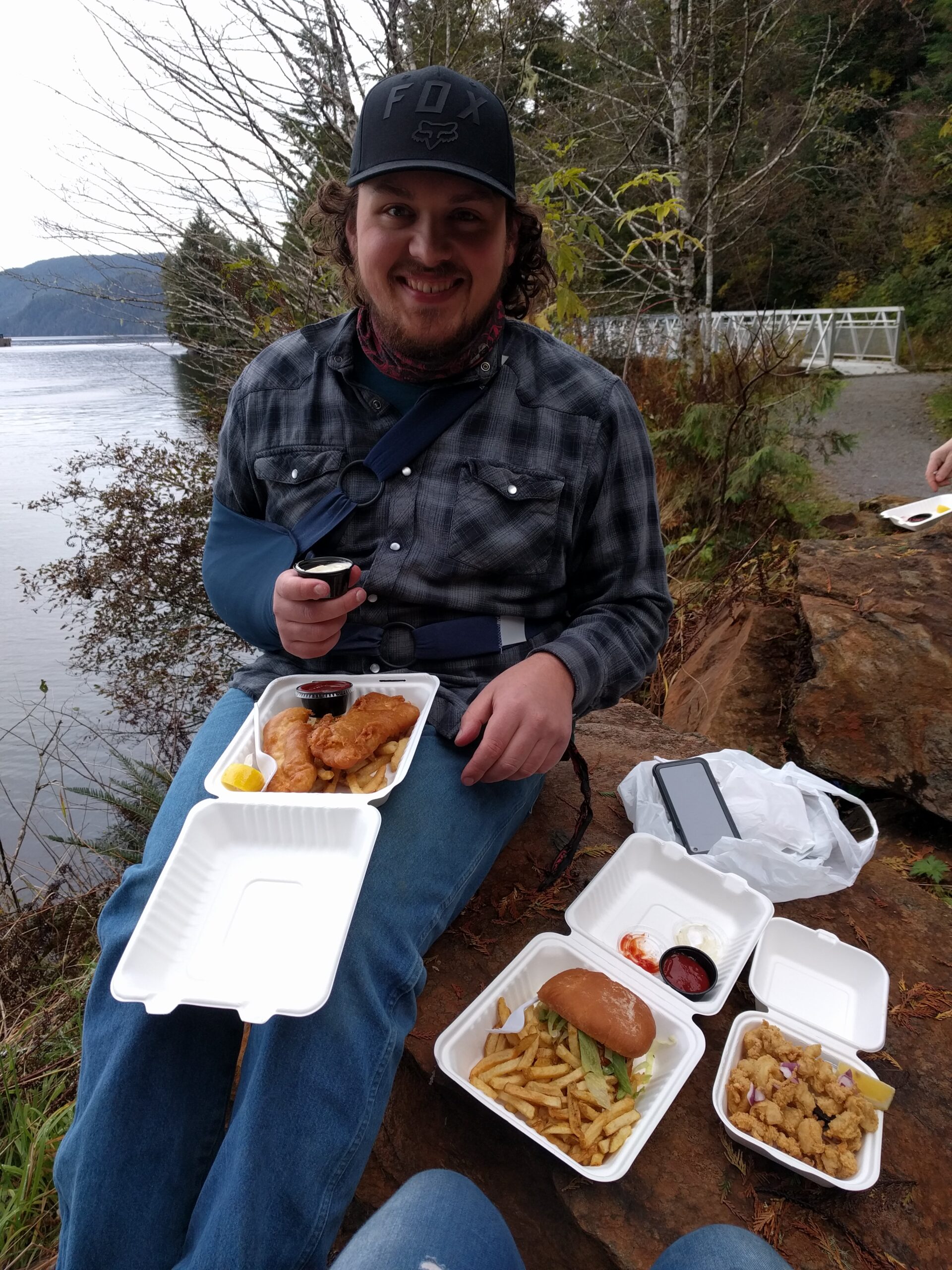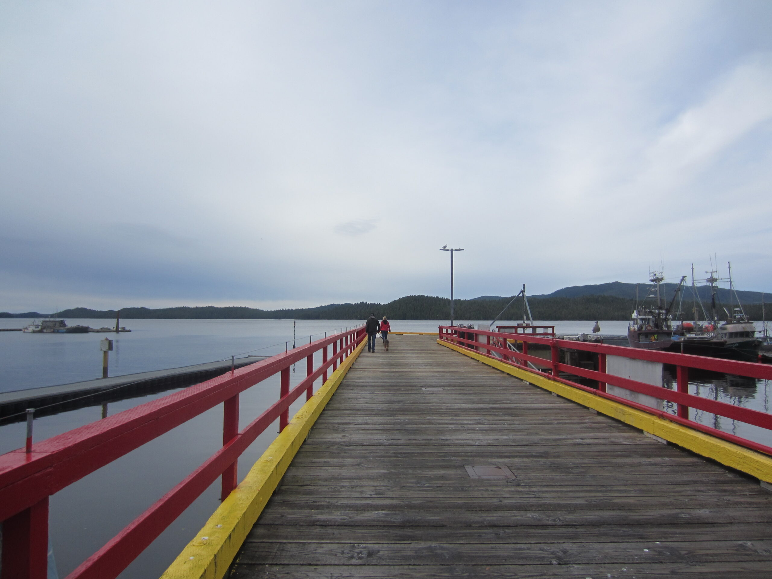 Today they wanted to show us Prince Rupert, a small town on Kaien Island directly on the North Pacific coast. It was a long drive there, a good 140 km. We wandered around and again discovered traces of the indigenous people in the form of artistically carved and colorfully painted totem poles. Cow Bay, a picturesque, historic harbor in bright red with small shops, galleries, cafes and restaurants, was particularly appealing to us. We bought delicious meals at the best seafood restaurant, „Dolly’s,“ and wandered along the waterfront for a bit until we found a suitable spot to feast.