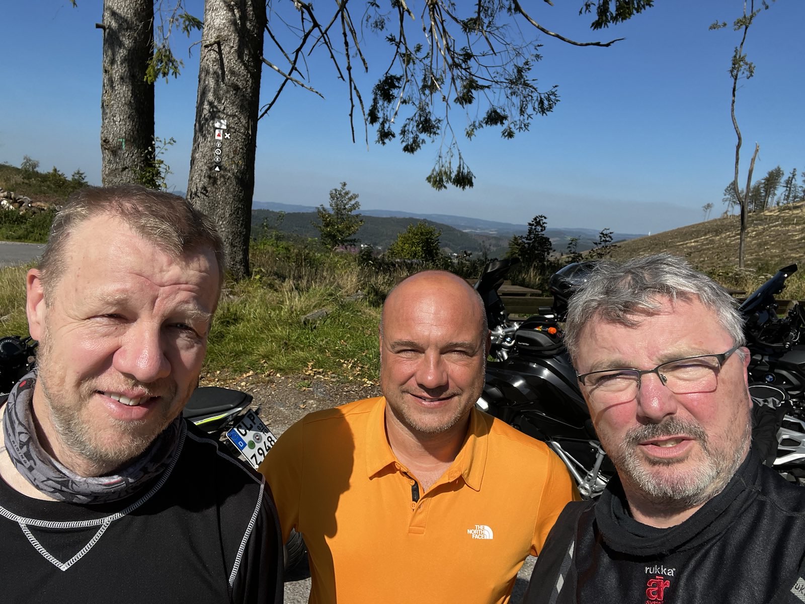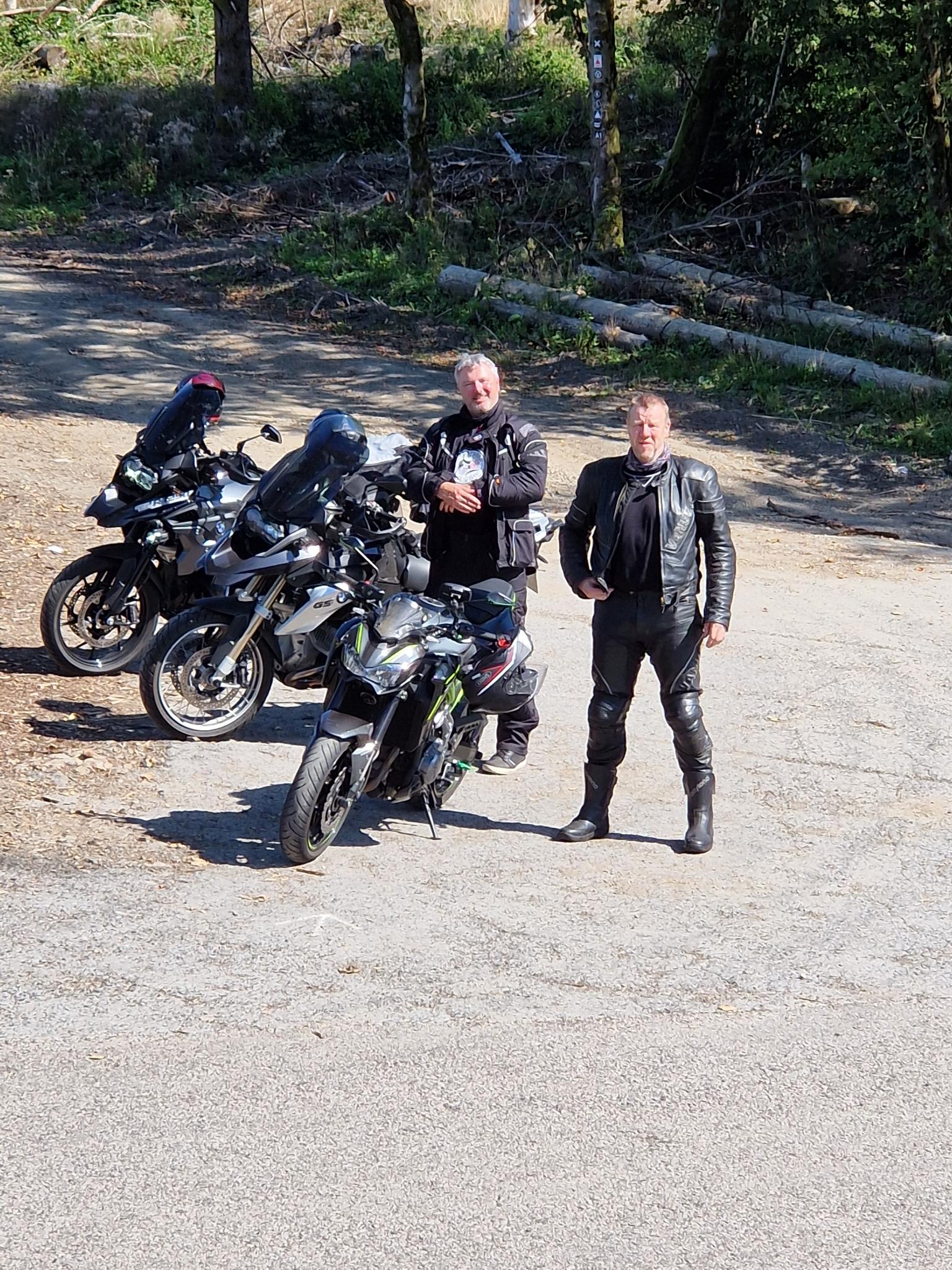 Also ging es locker und entspannt los, Matze war das erste Mal seit einem Jahr wieder auf dem Moped. Ich hatte mich schon lange auf diese Tour gefreut und nach kurzer Zeit wusste ich auch, warum. Ulli hatte, mal wieder, eine grandiose Route ausgearbeitet. Kleine, aber feine Straßen führten uns durch abgelegene Täler und auf die Bergkämme für tolle Ausblicke. Bei der ersten Pause schauten wir gegenseitig in unsere strahlenden Gesichter! Alle drei waren hochzufrieden. Das Wetter war großartig und die Laune konnte nicht besser sein…