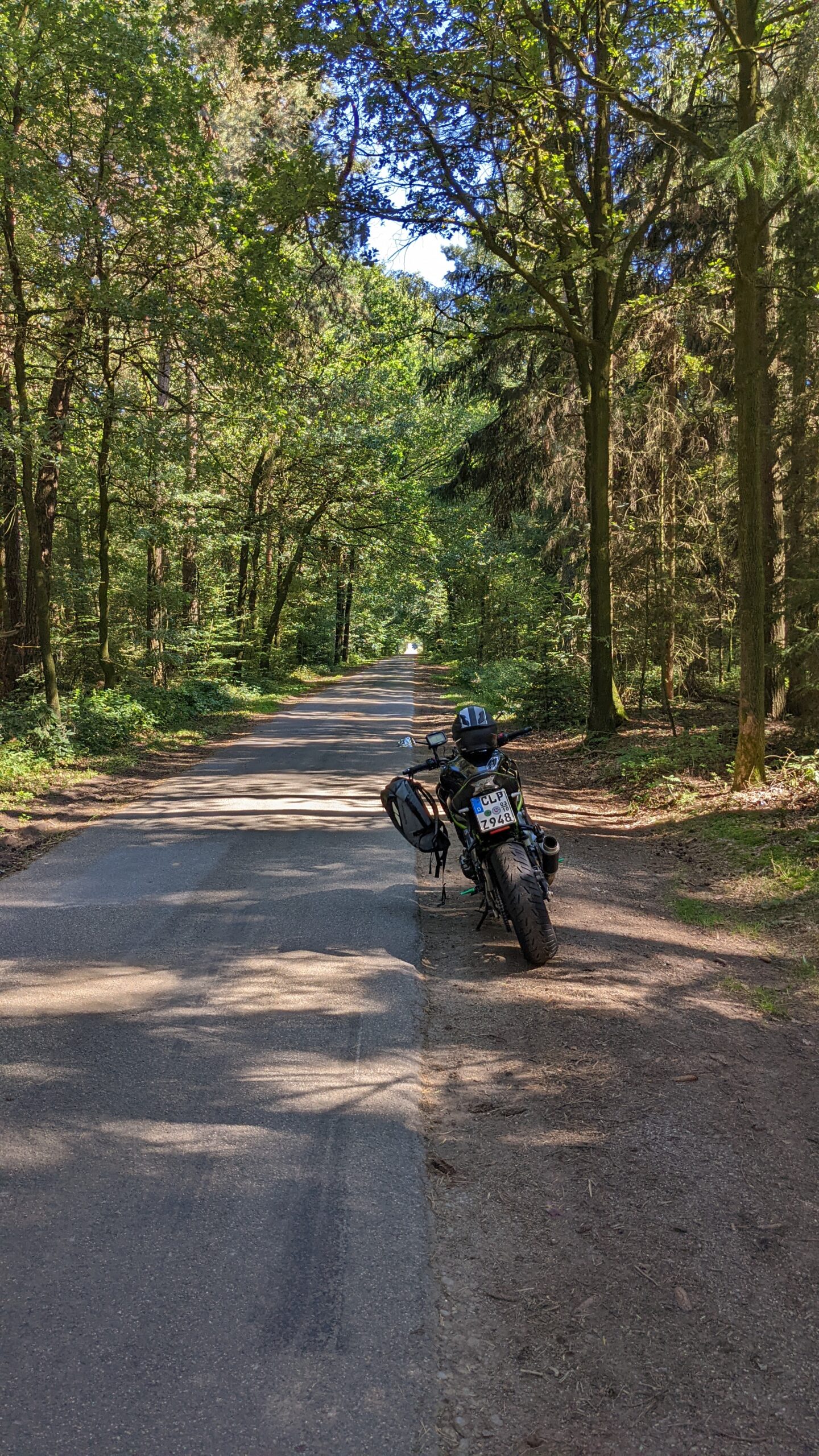 Gestartet bin ich am Freitag kurz nach 12 Uhr, da war es schon kuschelig warm. Aber auf den kleinen Nebenstraßen konnte man zum Großteil im Schatten der Straßenbäume fahren. So läßt es sich aushalten…