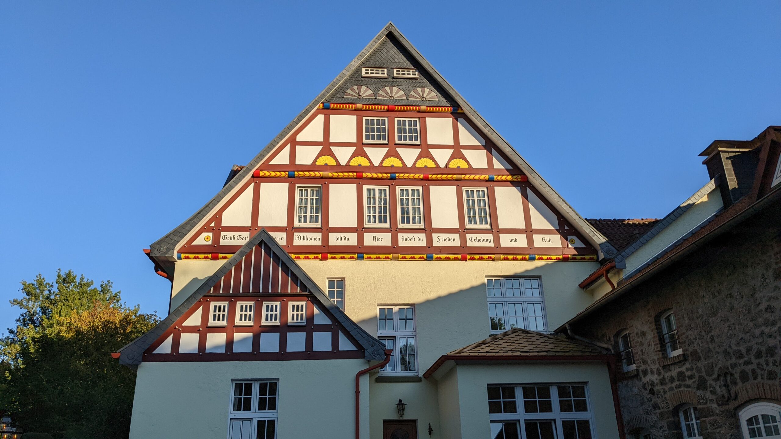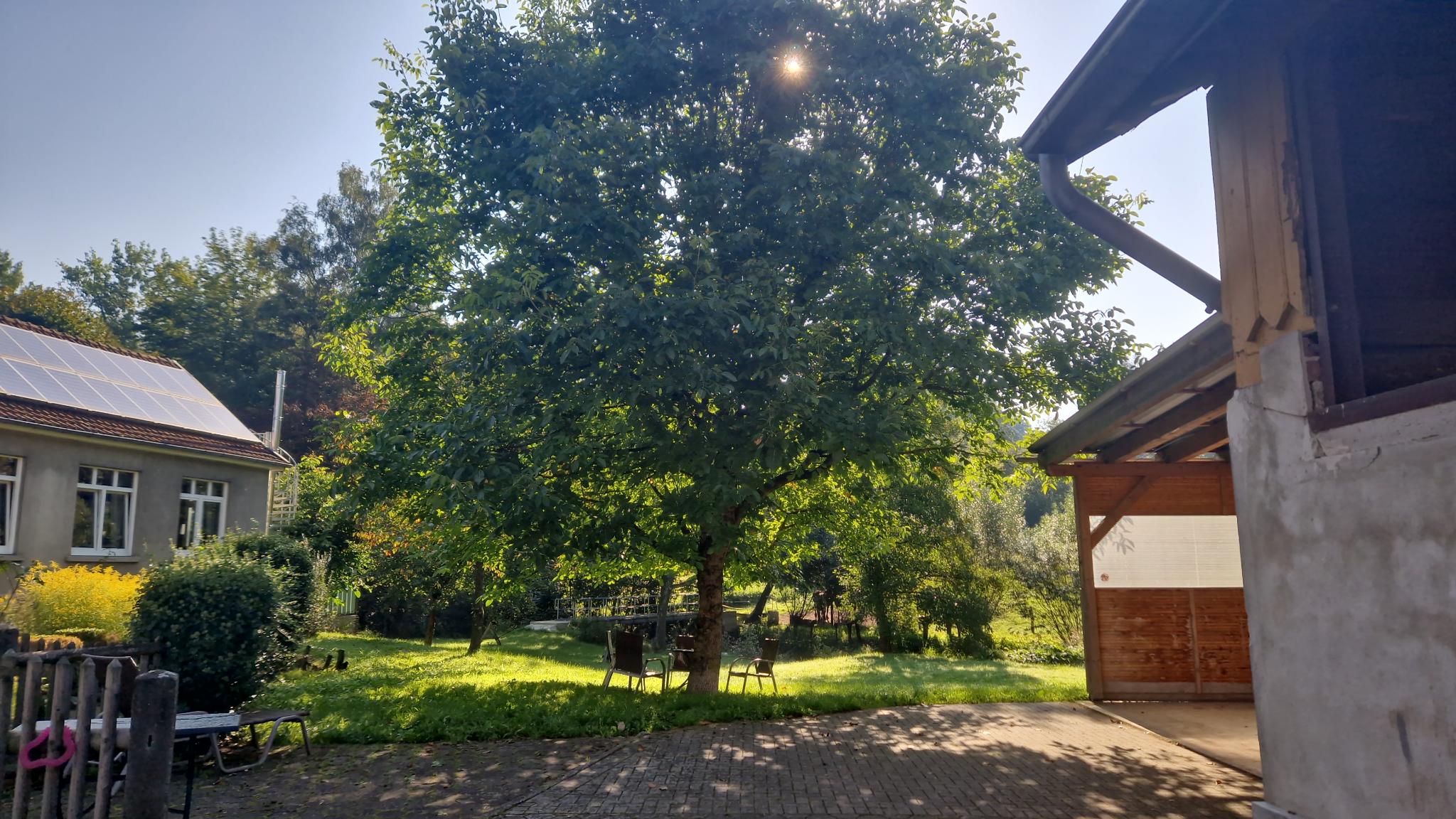 Ich parkte mein Moped im Unterstand und stieg ab. Bevor ich den Helm abnehmen konnte, stand Jasmin (eine der Mitarbeiterinnen im Haus Recke) schon mit einem frisch Gezapften vor mir und hieß mich willkommen! Dann hörte ich schon ein ‚Hallo‘ aus dem Schatten unter einem Baum, dort hatte es sich Ulli, unser Gastgeber, bequem gemacht. Also ließ ich meine Sachen erstmal am Moped hängen, setze mich dazu und genoß mein Bierchen. Wir hatten uns schon lange nicht mehr gesehen, so gab es Einiges zu erzählen.
