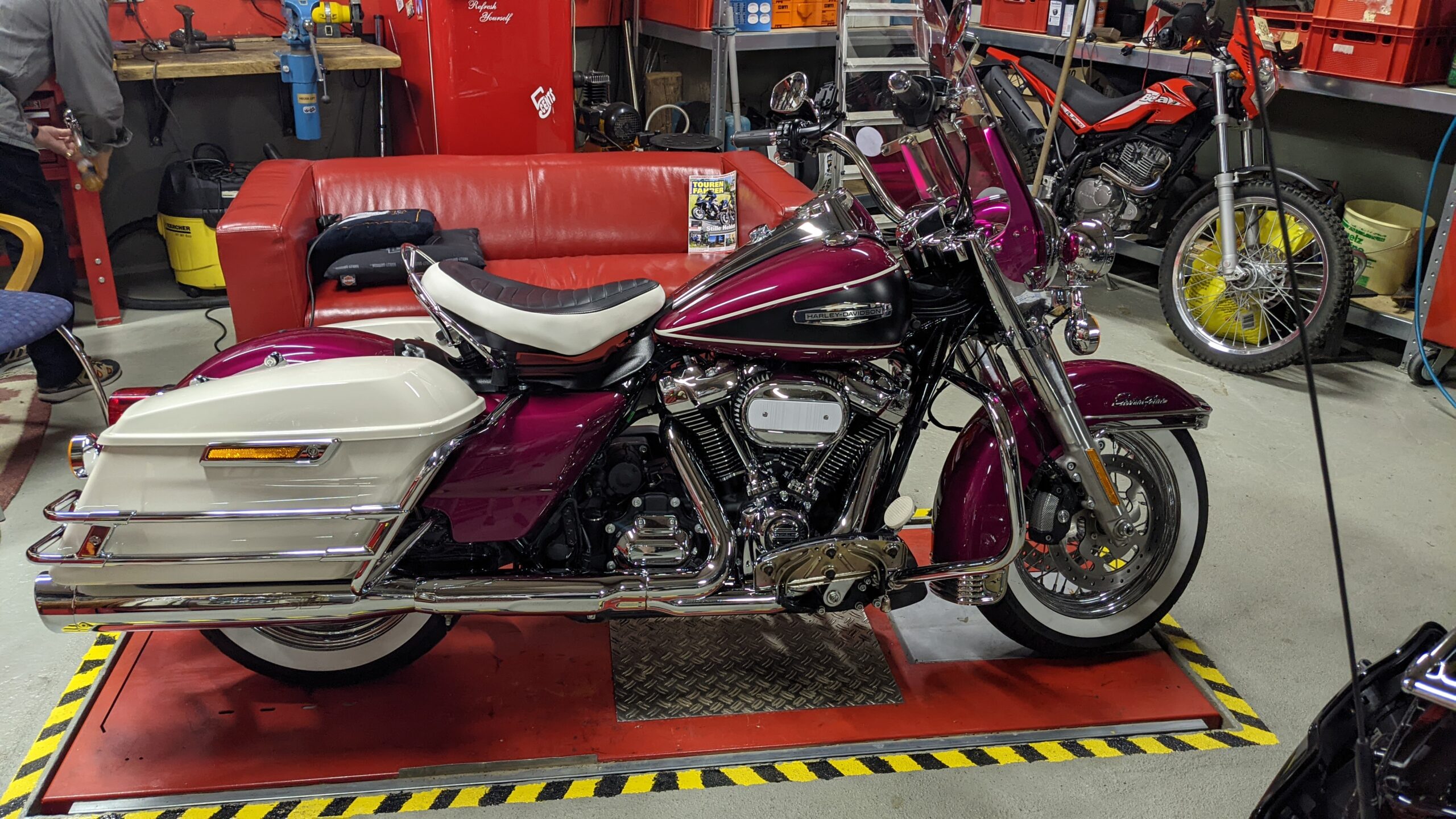 Nach einer Dusche ging es zum Essen, welches wieder hervorragend war. Wie am Vorabend versprochen, verwöhnte Ulli uns dann noch mit sehr edlen Tropfen aus seiner Havanna- und Whiskylounge. Müde vom Tag wollten wir dann eigentlich schlafen gehen. Aber wie schon so oft, „verirrten“ wir uns dann doch noch in Ulli’s Garage. Wer schon mal da war, kennt diesen Traum vieler Mopedfahrer… Eine große Halle mit Platz für viele Motorräder und Raum zum Schrauben. Dazu ein großes Sofa, ein stets gefüllter Kühlschrank und eine Wurlitzer Jukebox. Also gab es noch eine Runde ‚Corona Extra‘ und viele Fachgespräche. Die Müdigkeit war vergessen und die Zeit verging bei angeregter Fachsimpelei wie im Flug. Aber irgendwann schafften wir es doch in die Betten: Erschöpft, aber glücklich.