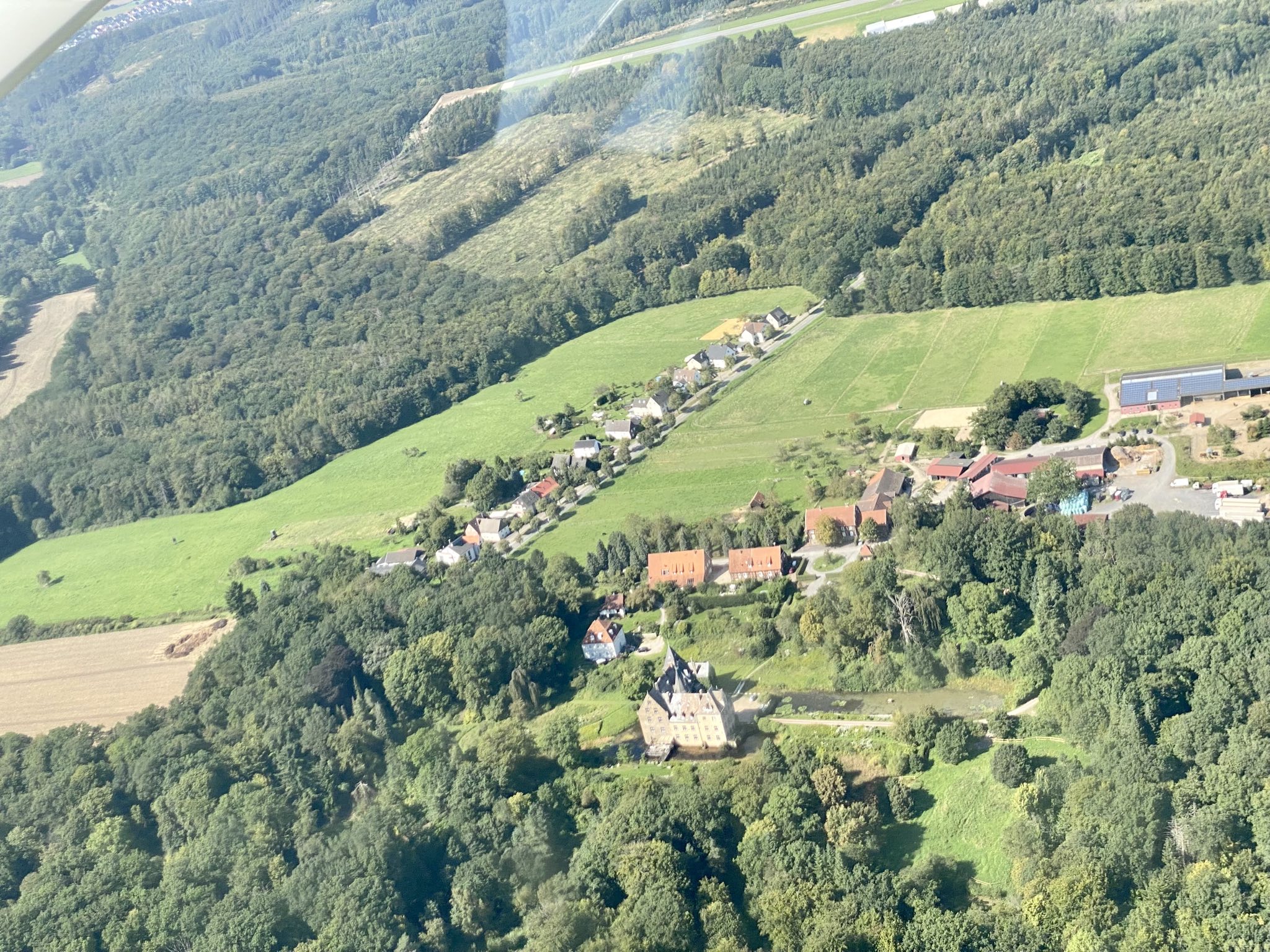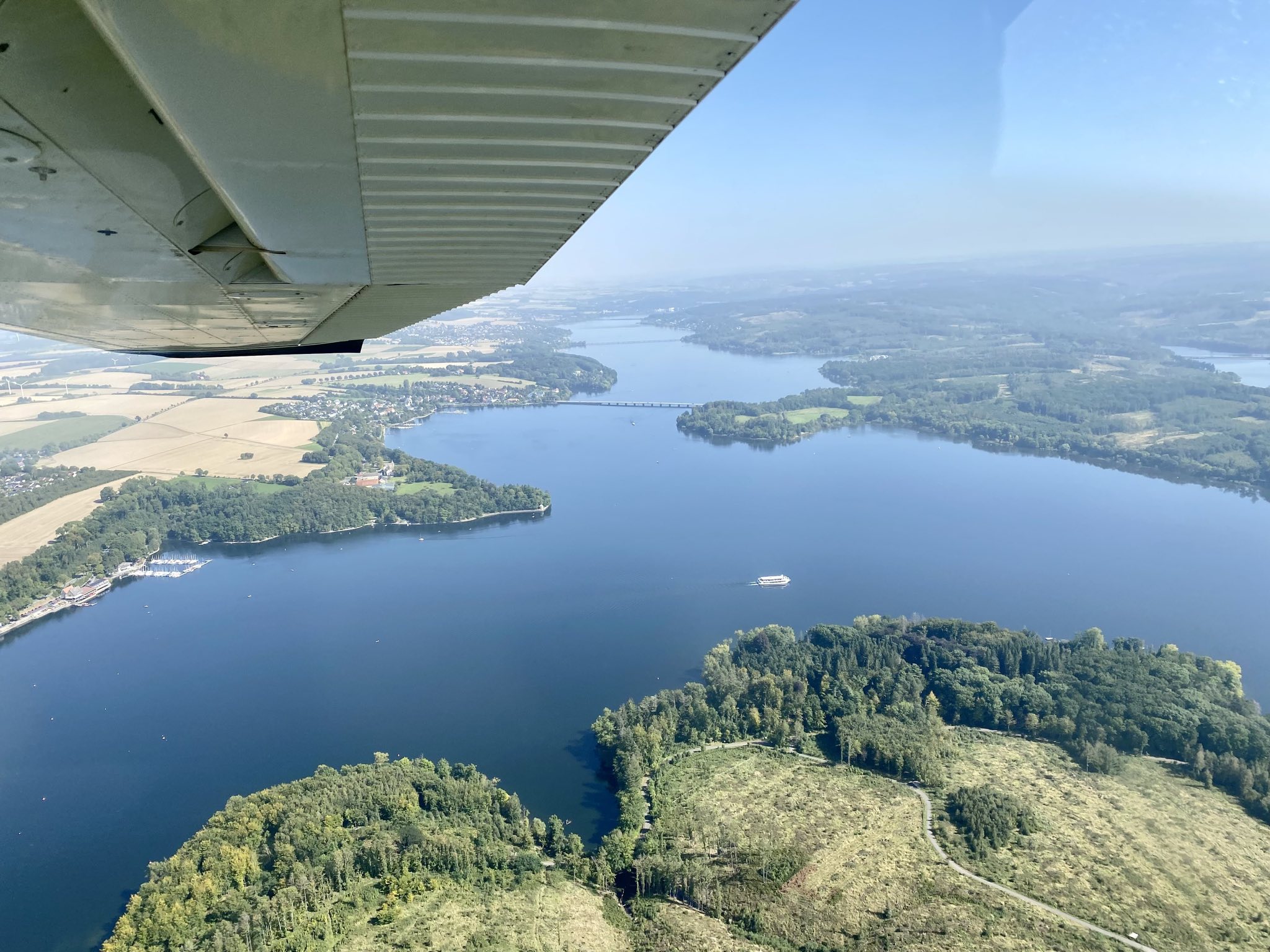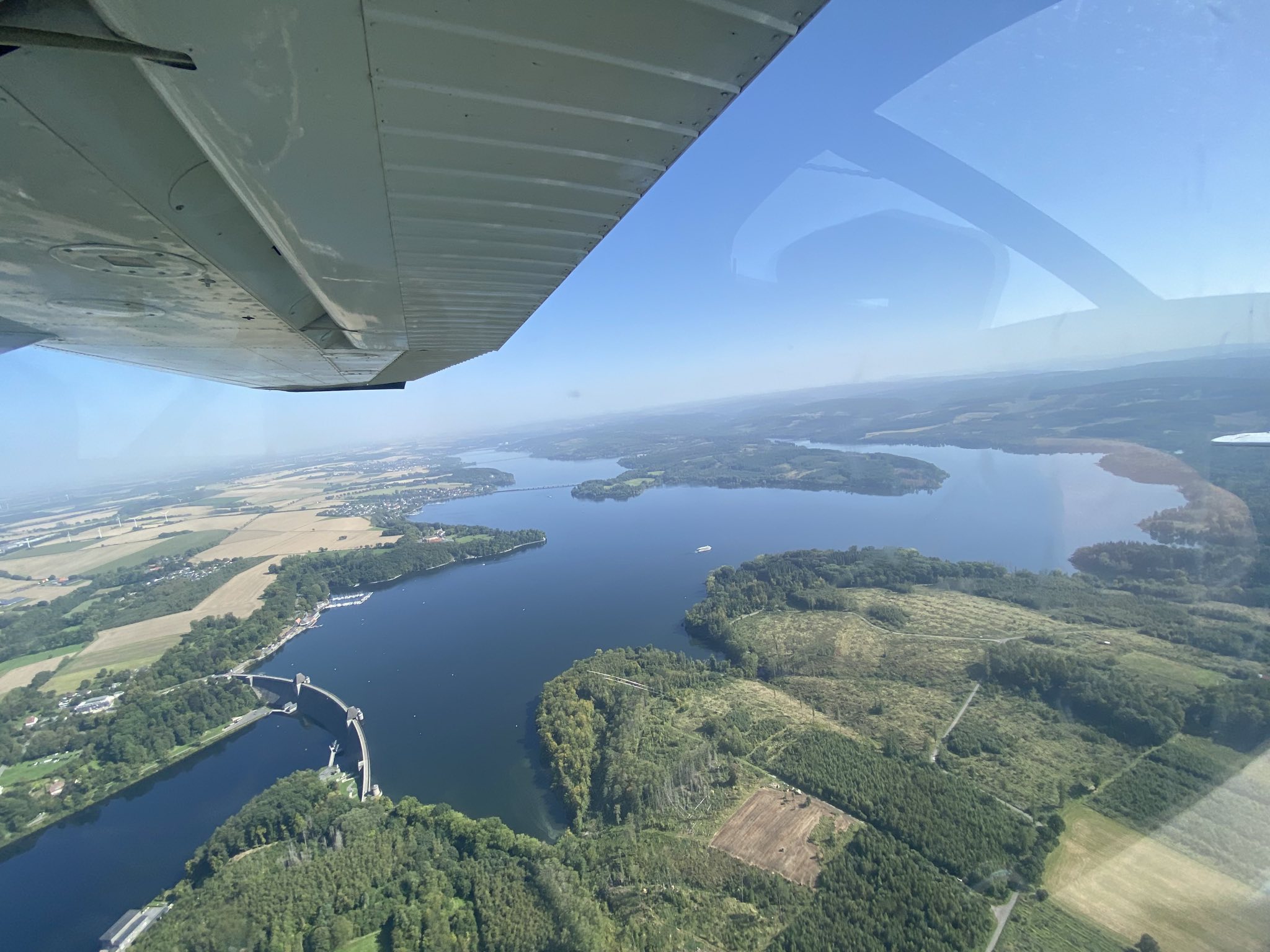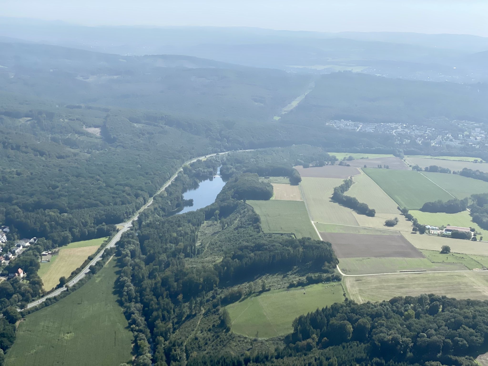 Dann gab es die Starterlaubnis vom Tower und wir erhoben uns in die Lüfte. Es war nicht das erste Mal, aber ich finde es immer wieder faszinierend, wie anders die Welt doch von oben aussieht. Unser Pilot (ehemaliger Berufssoldat) plauderte munter drauf los und vermittelte Wissenwertes über die Orte am Boden. Manches kann man auch nur von hier oben erkennen… So drehten wir eine schöne Runde über das Sauerland und überflogen auch noch das Haus von Aline und Lukas…