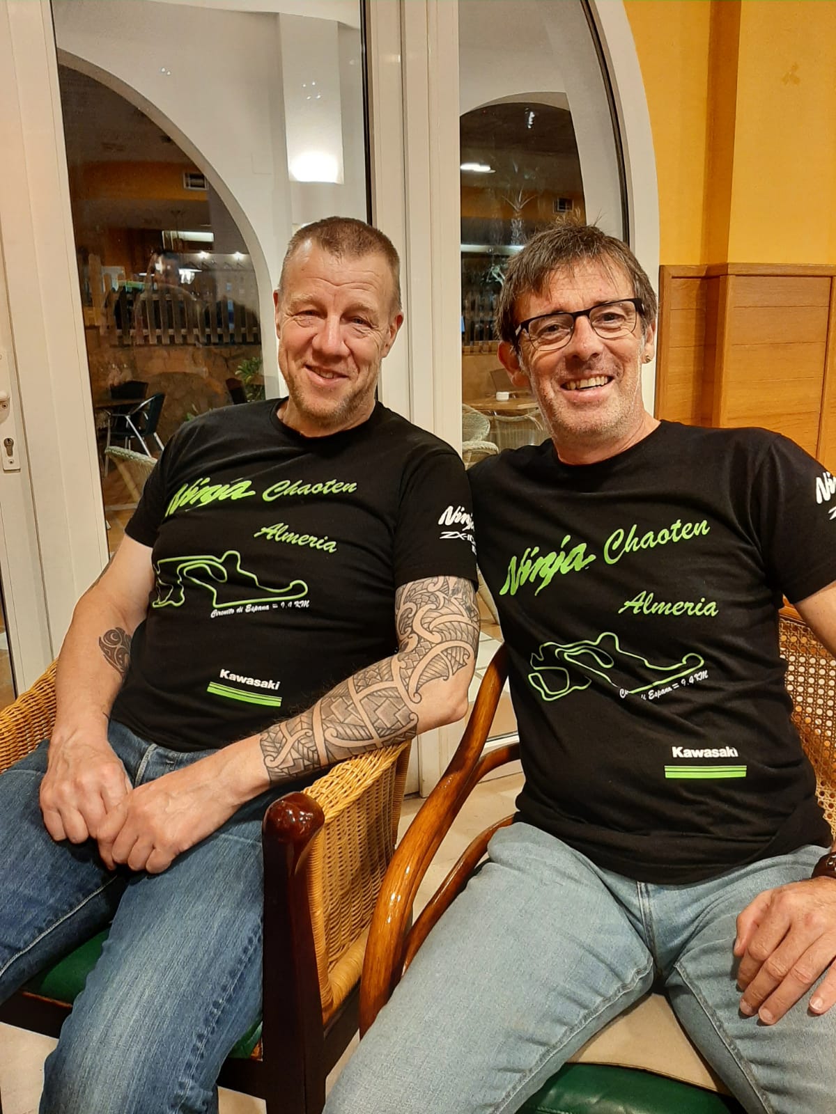 Pünktlich standen wir morgens am reichhaltigen Frühstücksbuffet. Die Auswahl war groß und für jeden Geschmack etwas dabei. Da wir den gestrigen Kennenlern-Abend verpasst hatten, war ich auf der Suche nach Gästen, die so aussahen, als hätten sie was mit Motorrädern am Hut. Das waren gefühlt alle! Jeder trug ein T-Shirt mit Motorsport-Aufdruck oder Namen wie Honda, Kawasaki, etc. Nach kurzem Suchen entdeckte ich Carsten, einen unserer Instruktoren, das Gesicht kannte ich von der Webseite. OK, damit hatten wir auch unseren Platz am Tisch mit den anderen Teilnehmern gefunden. Hier trafen wir auch auf Karl-Heinz, den zweiten Instruktor, mit dem ich während der Planung schon mehrfach telefoniert hatte. Um 8:30 Uhr sollte dann Abfahrt zur Rennstrecke sein, alle standen mit den Mopedklamotten pünktlich vor dem Hotel. Einer der Jungs kam mir irgendwie bekannt vor und er schaute mich auch nach dem Motto ‚Dich kenn ich doch?‘ an. Das musste geklärt werden. „Hey, ich glaub ich kenn dich, bist Du hier schon mal gefahren?„, fragte ich. „Ja, ich bin fast jedes Jahr hier„, war die Antwort. Ich entgegnete: „Ich war 2019 hier, da sind wir die große 9,4 km-Runde gefahren„. „Ja, da war ich auch dabei.“ Dann war ja alles klar, großes Gelächter und Hallo. Knut fragte dann gleich, ob ich ‚das T-Shirt‘ dabei hätte. Er hatte nämlich damals die ganze Truppe damit versorgt. Natürlich hatte ich das eingepackt, so konnten wir dann abends schon mal ein schönes Foto machen.