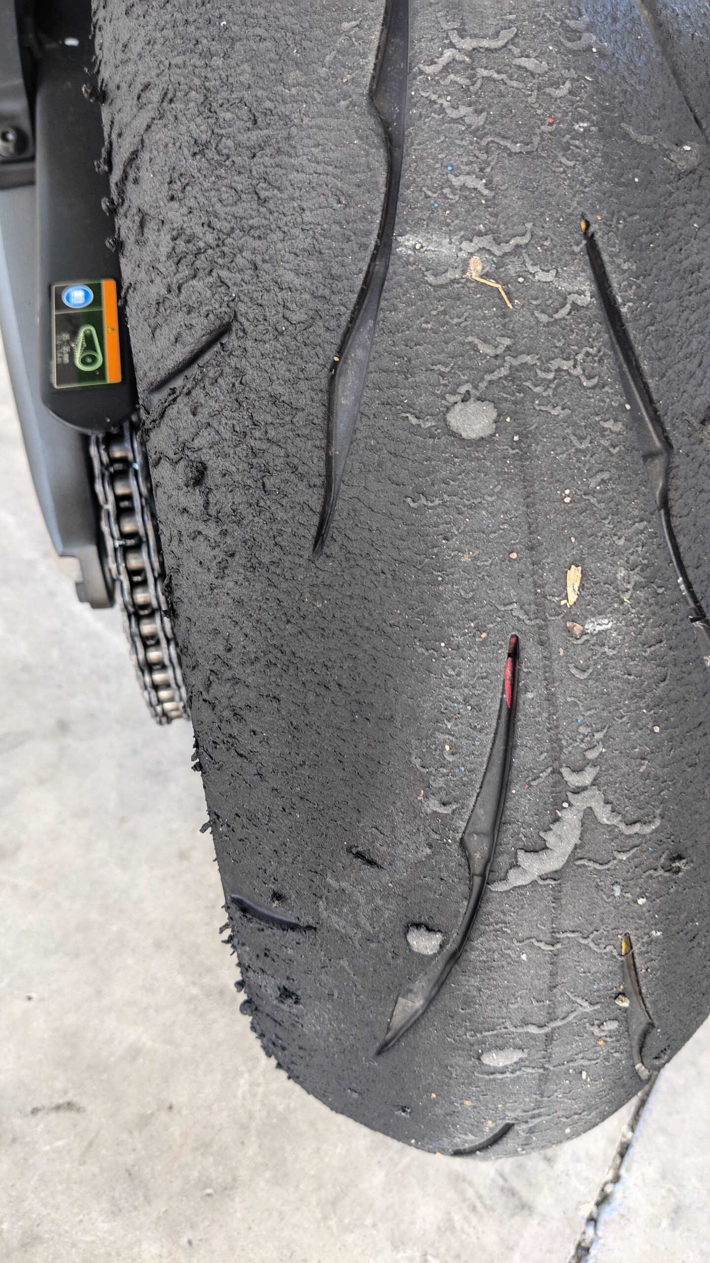 Im letzten Turn war ich mit Carsten alleine unterwegs, wir waren wirklich zügig unterwegs und holten den anderen Teil unserer Truppe langsam ein. Wir überholten einen nach dem anderen, alles bestens. Bis ich dann beim letzten Überholvorgang eine falsche Linie in die Kurve wählte. Das passte dann auf einmal gar nicht mehr, Bremsen half auch nichts. Also: Bremsen los, Moped aufgerichtet und schön geradeaus ins Kiesbett rollen… Leider fing die ZX10-R dann etwas an zu bocken und warf mich ab. Ich landete unsanft im Kies, konnte mich aber nach einmal Durchatmen wieder aufrappeln und das Moped hinstellen. Der spanische Streckenposten war schnell zur Stelle und brachte uns beide zurück an die Box. Nichts Schlimmes passiert, an der Verkleidung und am Auspuff gab es einige Kratzer, sonst war aber alles heil geblieben. Meine Rippen schmerzten etwas, aber ich konnte mich frei bewegen, somit kein Problem.