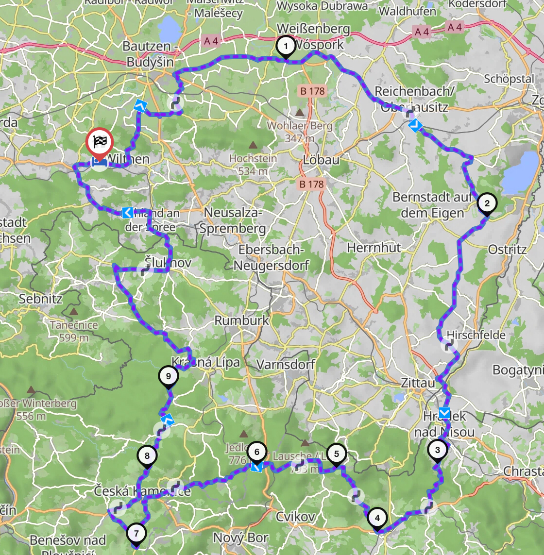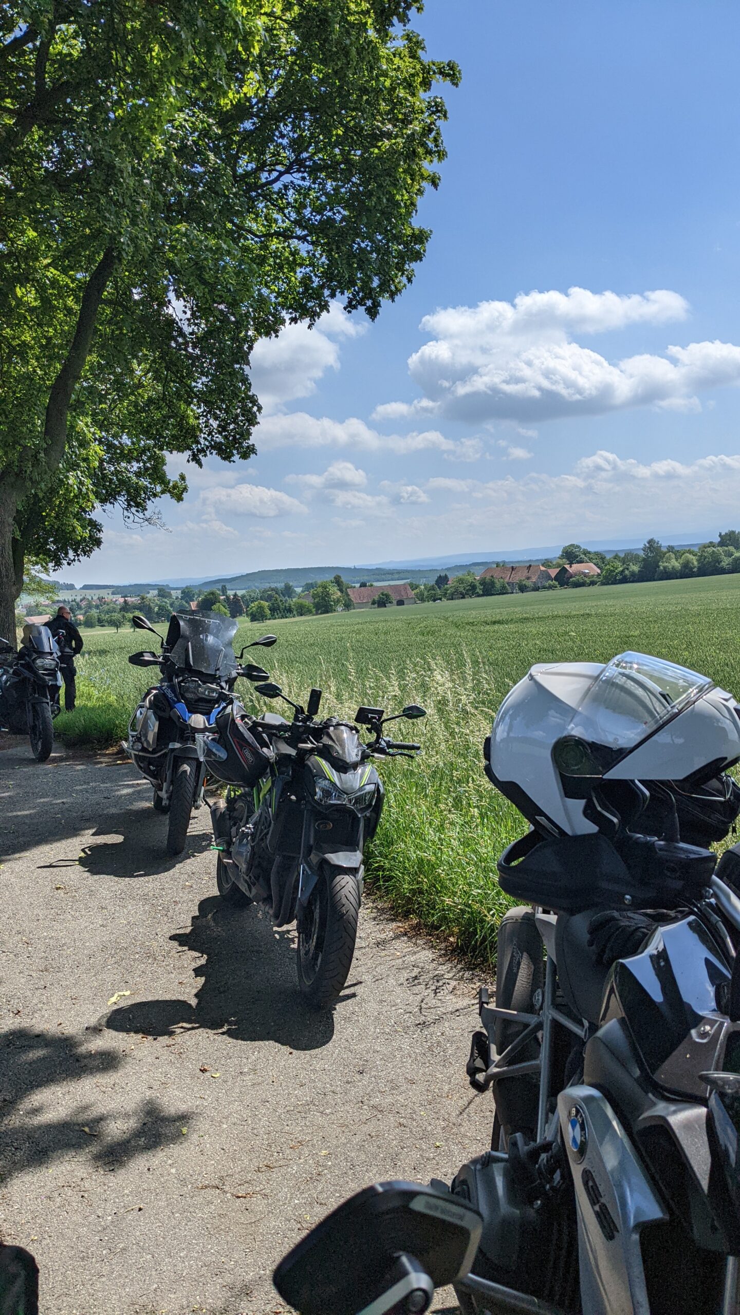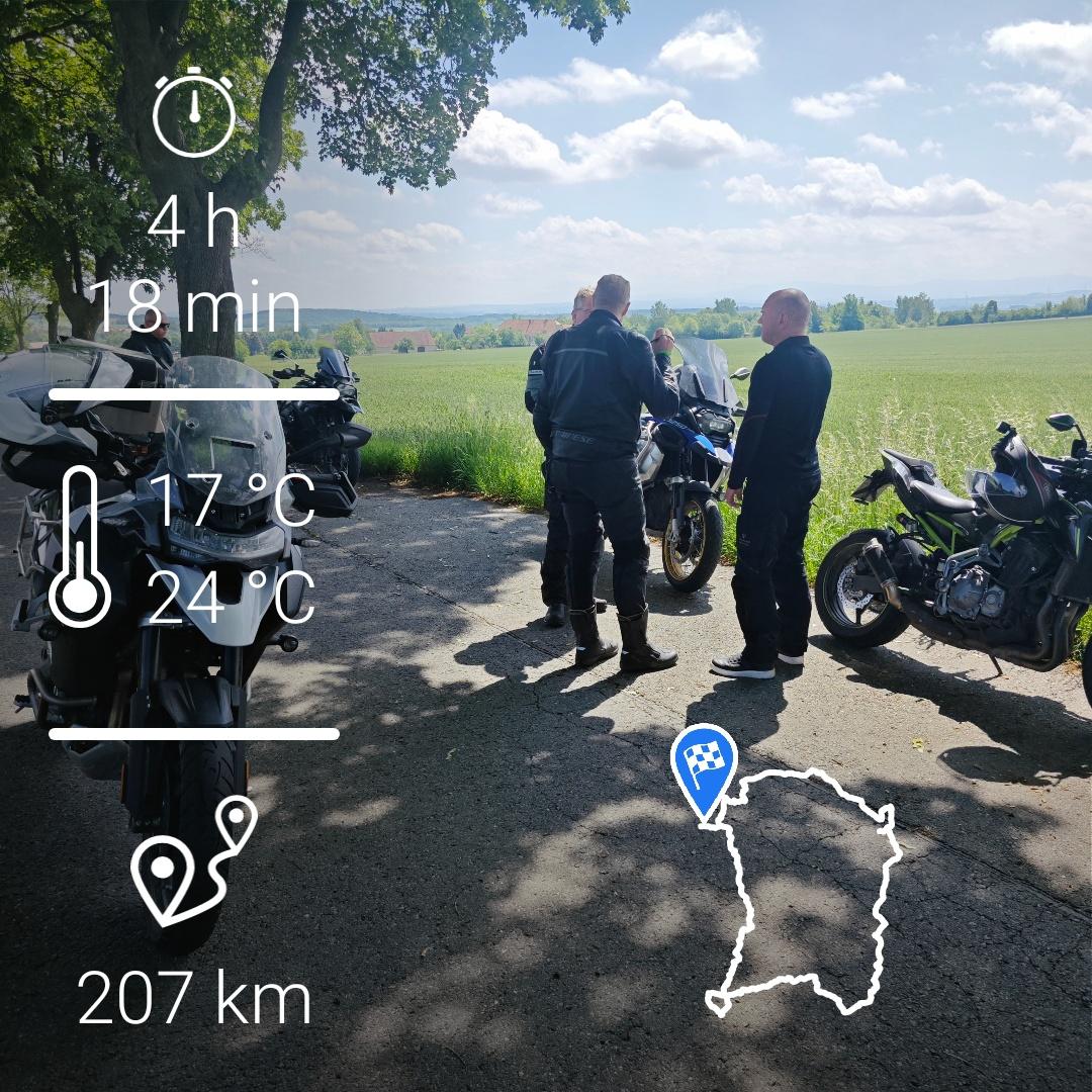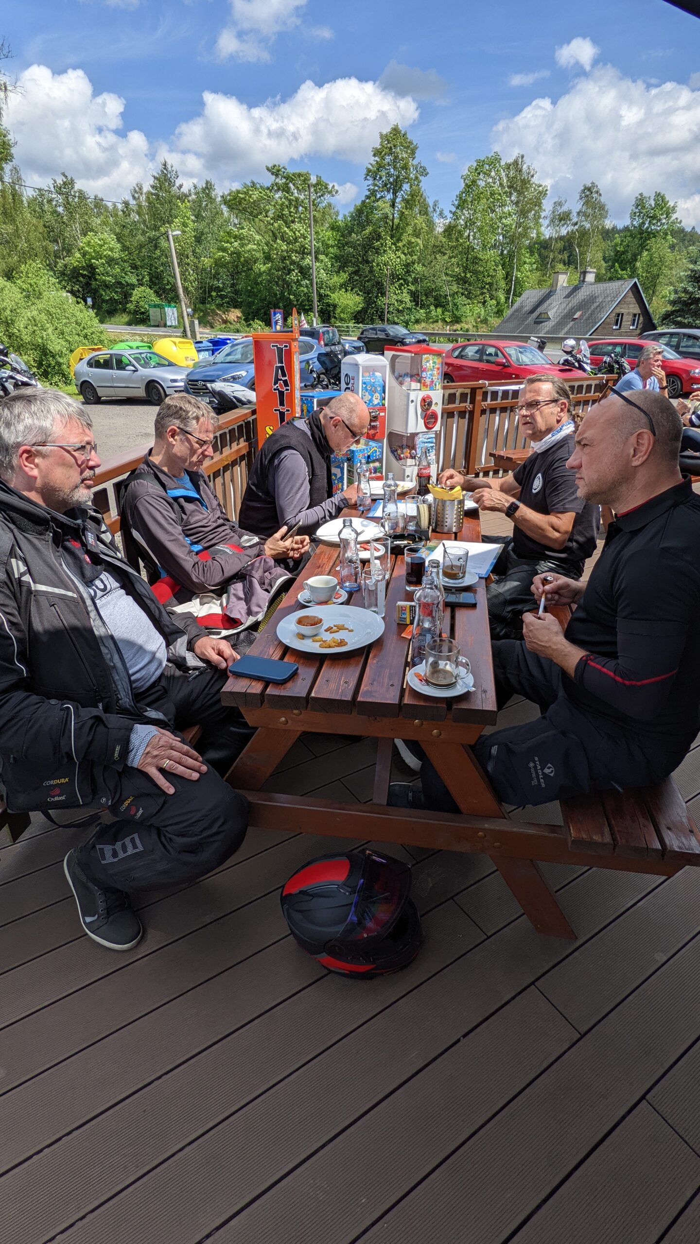 Unsere heutige Tour fand wieder komplett im Trockenen bei strahlendem Sonnenschein statt. Petrus meint es gut mit uns. Oberlausitz, Polen und Tschechien wurden heute wieder auf größtenteils kleinen Straßen erfahren. Da es ein paar Unstimmigkeiten bei der Routenberechnung gab, wurde die Last der Gruppenführung auf mehrere Schultern verteilt. Das klappte ziemlich gut und Achim stellte fest, wie entspannt es ist, nur hinterher zu fahren, während die Aushilfs-Tourguides wieder merkten, dass vorweg fahren doch etwas anstrengender ist. Aber alles lief super, bis auf den kleinen Schreckmoment, in dem wir feststellten, dass in Tschechien anscheinend keine Warnschilder bei Rollsplit aufgestellt werden. Es sind aber alle sitzen geblieben…