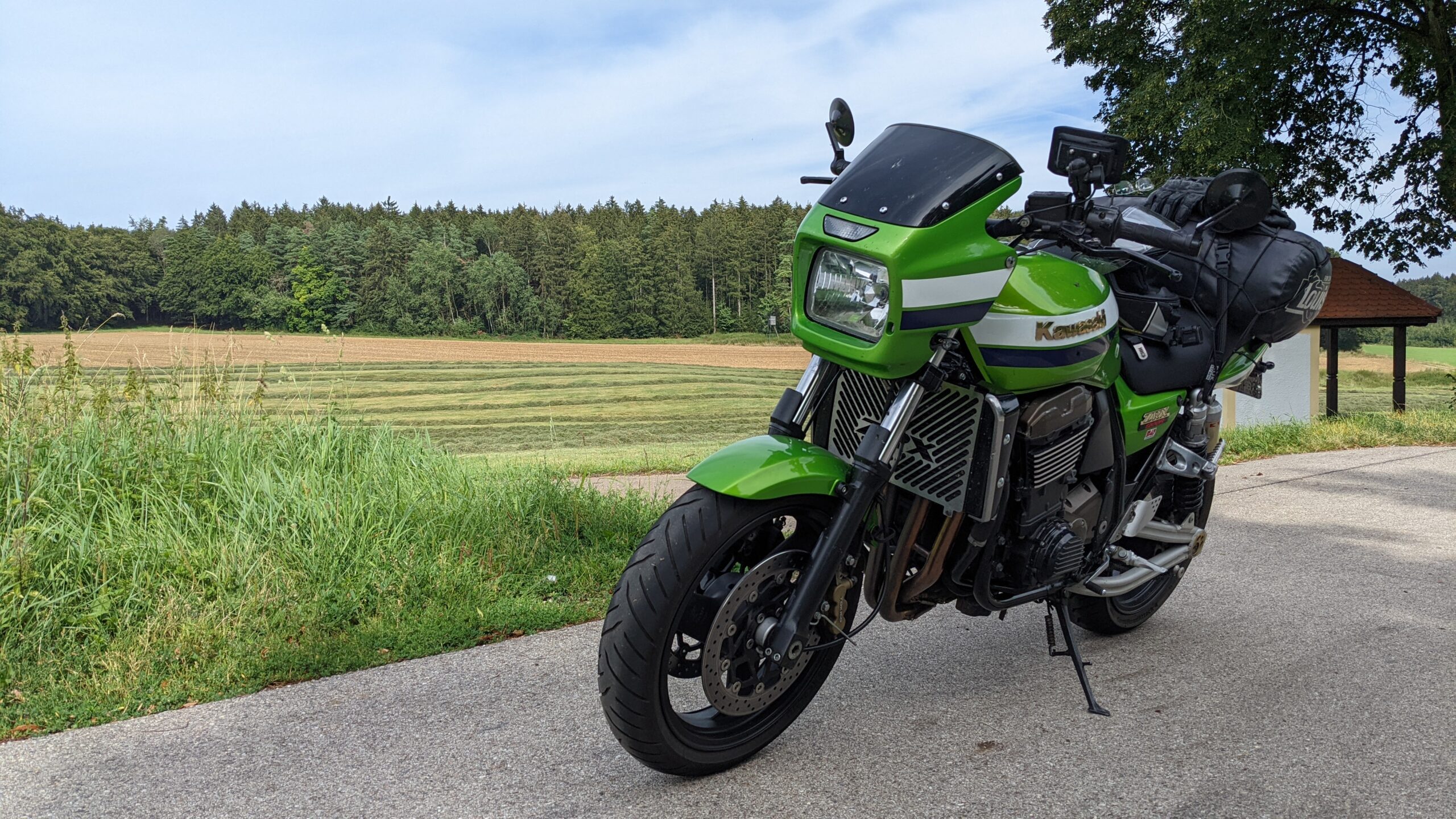 Heute war ‚Strecke machen‘ angesagt, es waren ca. 380 km Tour geplant. Es ging also Richtung Nordwesten, häufig über die „Güterwege“. Das sind kleine, hauptsächlich landwirtschaftlich genutzte Straßen, gerade breit genug für einen Trecker. Das war sehr schön, da es so gut wie keinen Verkehr gab und ich interessante Einblicke in so manchen Hinterhof hatte. Somit verging der erste Teil der heutigen Reise bis zur Überquerung der Inn fast wie im Fluge. Nachdem ich wieder in Deutschland (Bayern) war, wechselte ich auf die größeren Bundesstraßen, die in weiten Schwüngen durch die Landschaft führten. So war es ein entspanntes Cruisen und ich kam trotzdem gut voran.