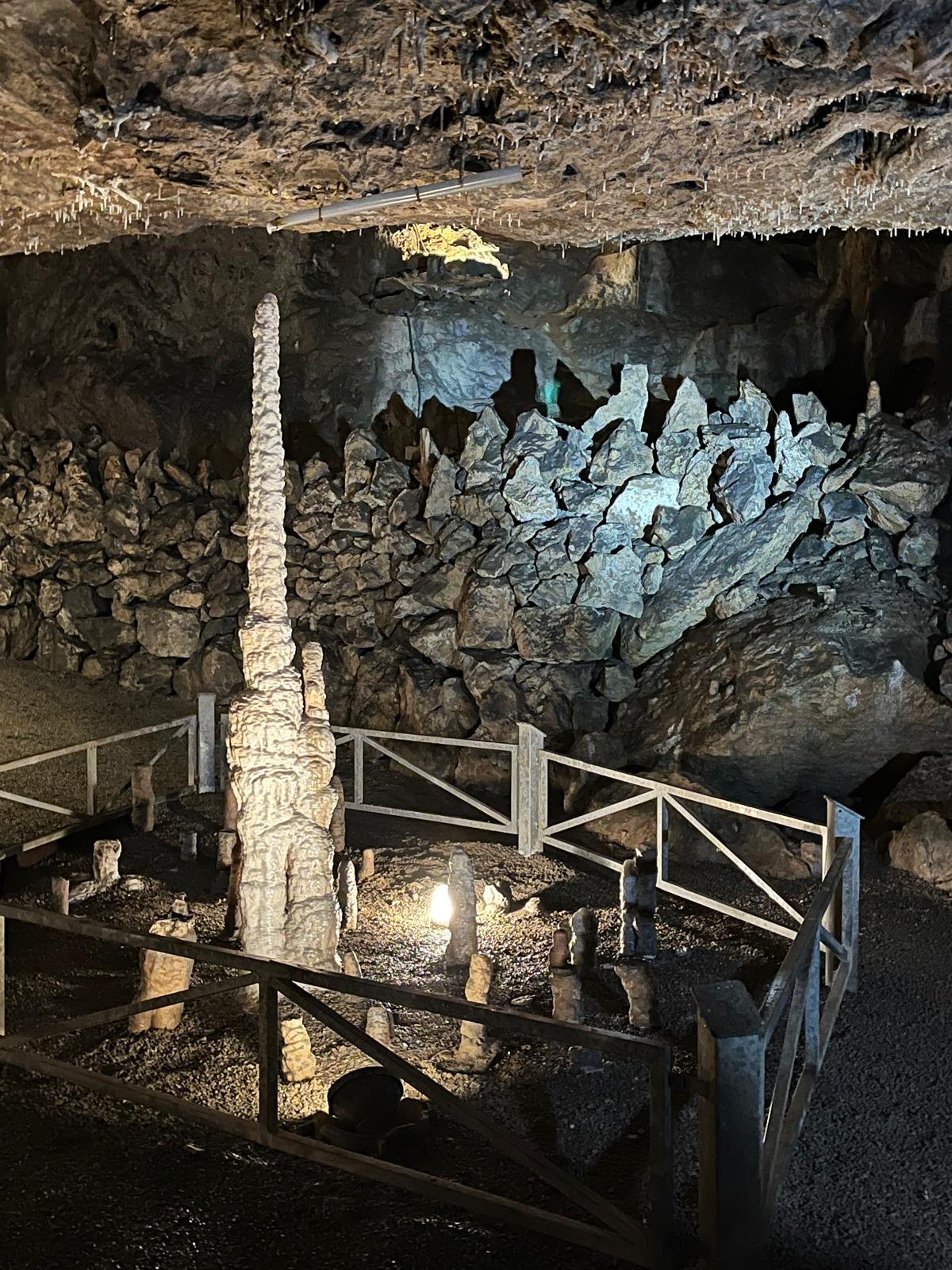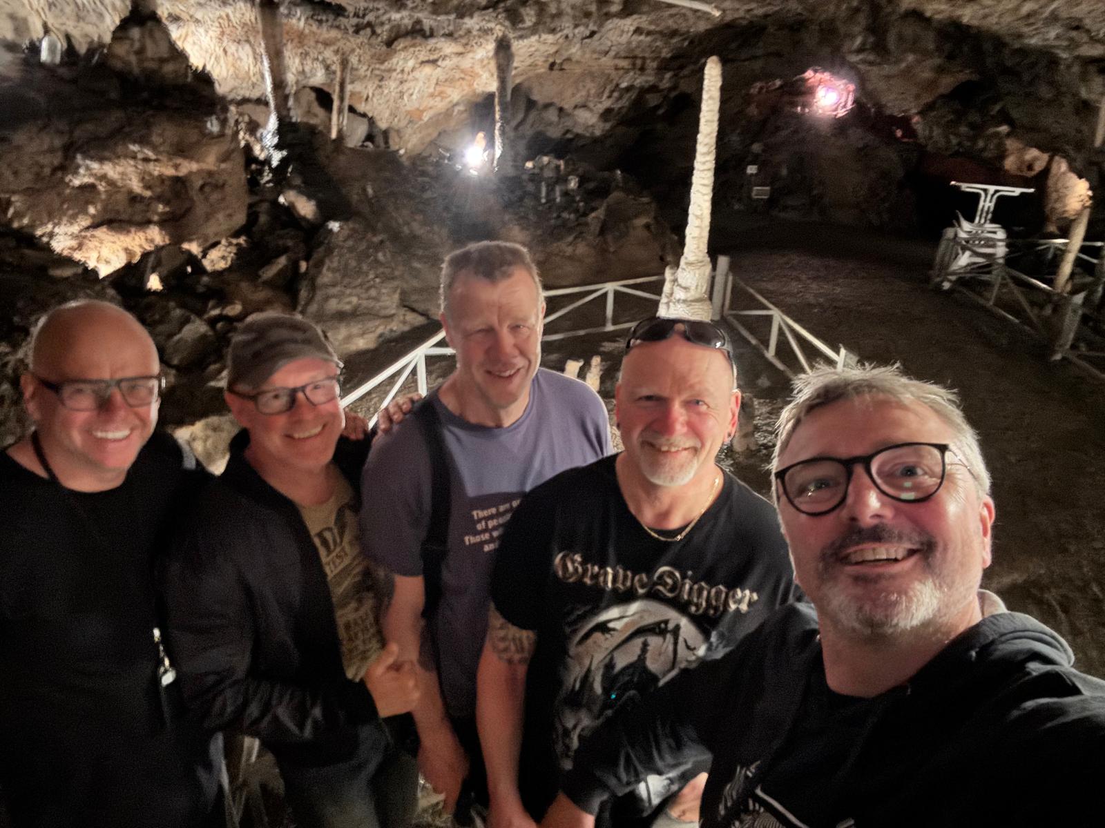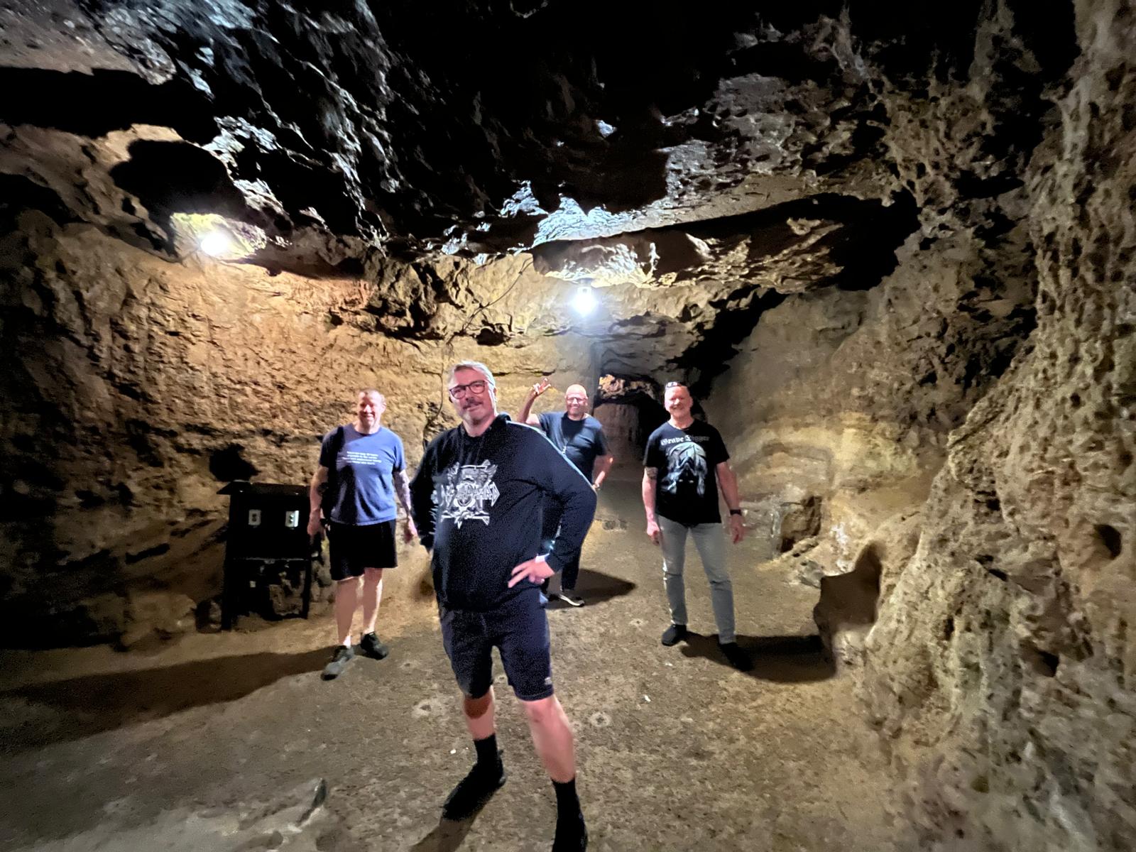 Aber vorher ging es noch in die hauseigene Tropfsteinhöhle, ich erhielt den großen Schlüssel und die Taschenlampe und zu fünft machten wir uns auf Erkundungstour. Während draußen am Abend noch fast 30° herrschten, war es in der Höhle mit 9° angenehm frisch. Wir kletterten, staunten und „fachsimpelten“ über die verschiedenen Tropfsteinarten. Vor allem Matze erwies sich als Experte… Am Ende der Runde beherzigten wir den Rat unserer Gastgeber und wagten uns nur langsam und vorsichtig zurück in die Hitze. Bei dem Einen oder Anderen hat da wohl schon der Kreislauf versagt. Für uns dann aber kein Problem…