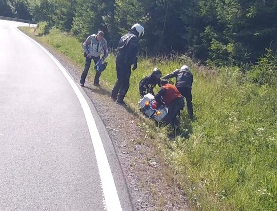 Apropos Spezial: Wir waren grad recht zügig auf einer wunderschönen Strecke unterwegs, als der Zug plötzlich abrupt zum Stehen kam. Als ich um die Ecke kam, wunderte ich mich, dass unser Tourguide zu Fuß unterwegs war. Und warum liegt die wunderschöne, pinkfarbene Harley 1,5 Meter tiefer im Graben? Also gestoppt und alle runter vom Moped, um zu helfen. Auf die Frage „Uli, geht’s dir gut?“ kam als Antwort nur: „Na klar, ich hab Enduroerfahrung!“ Typisch Uli und schon fast wieder witzig…
