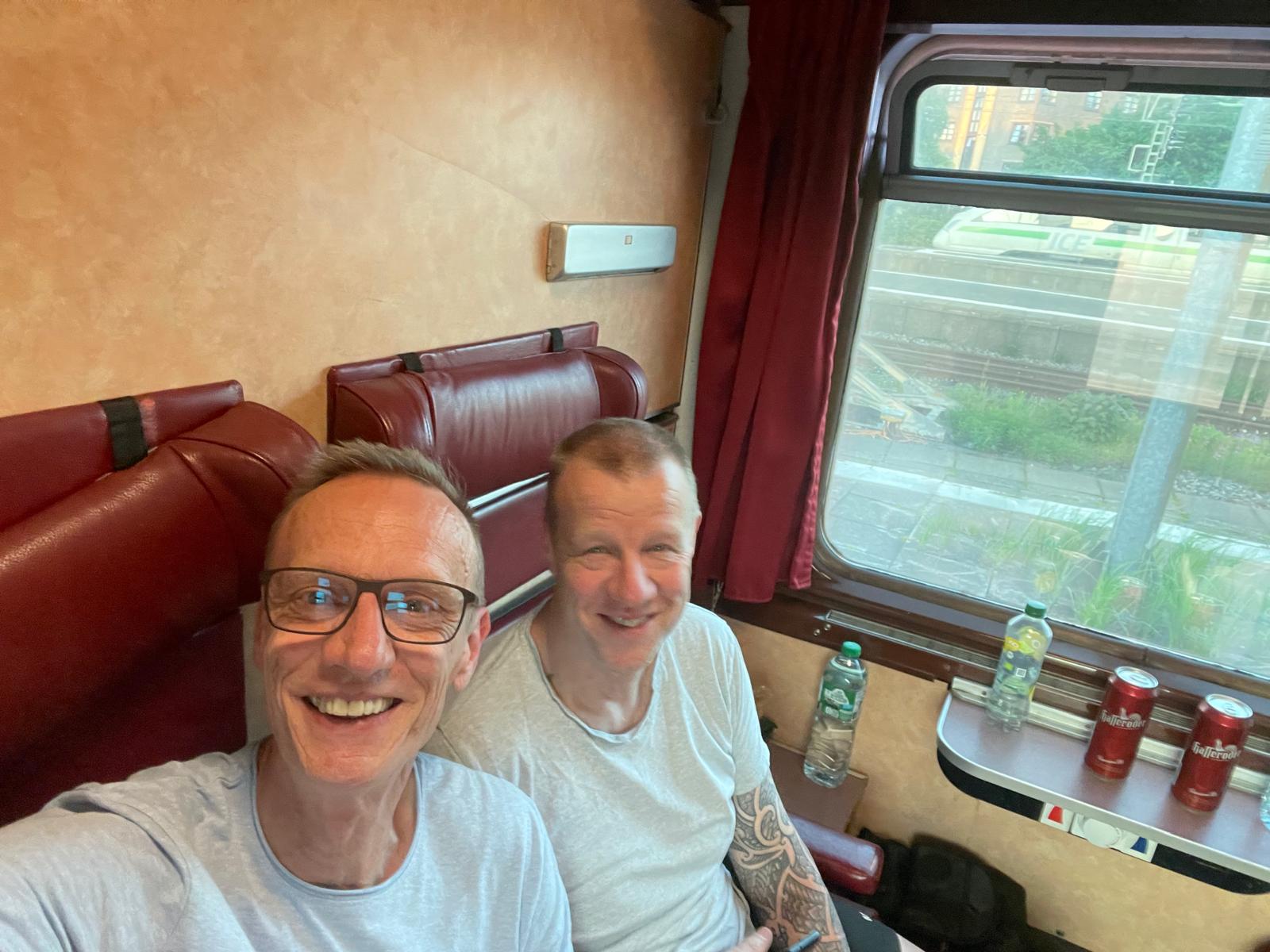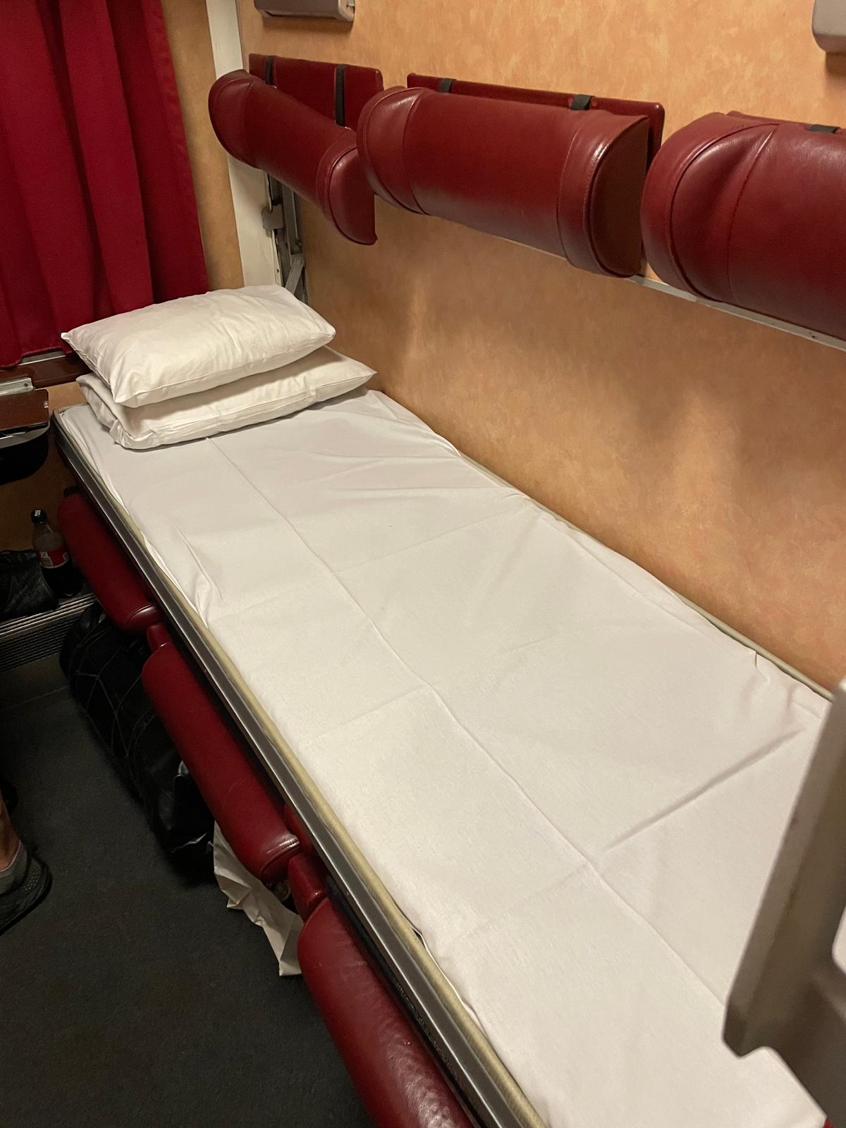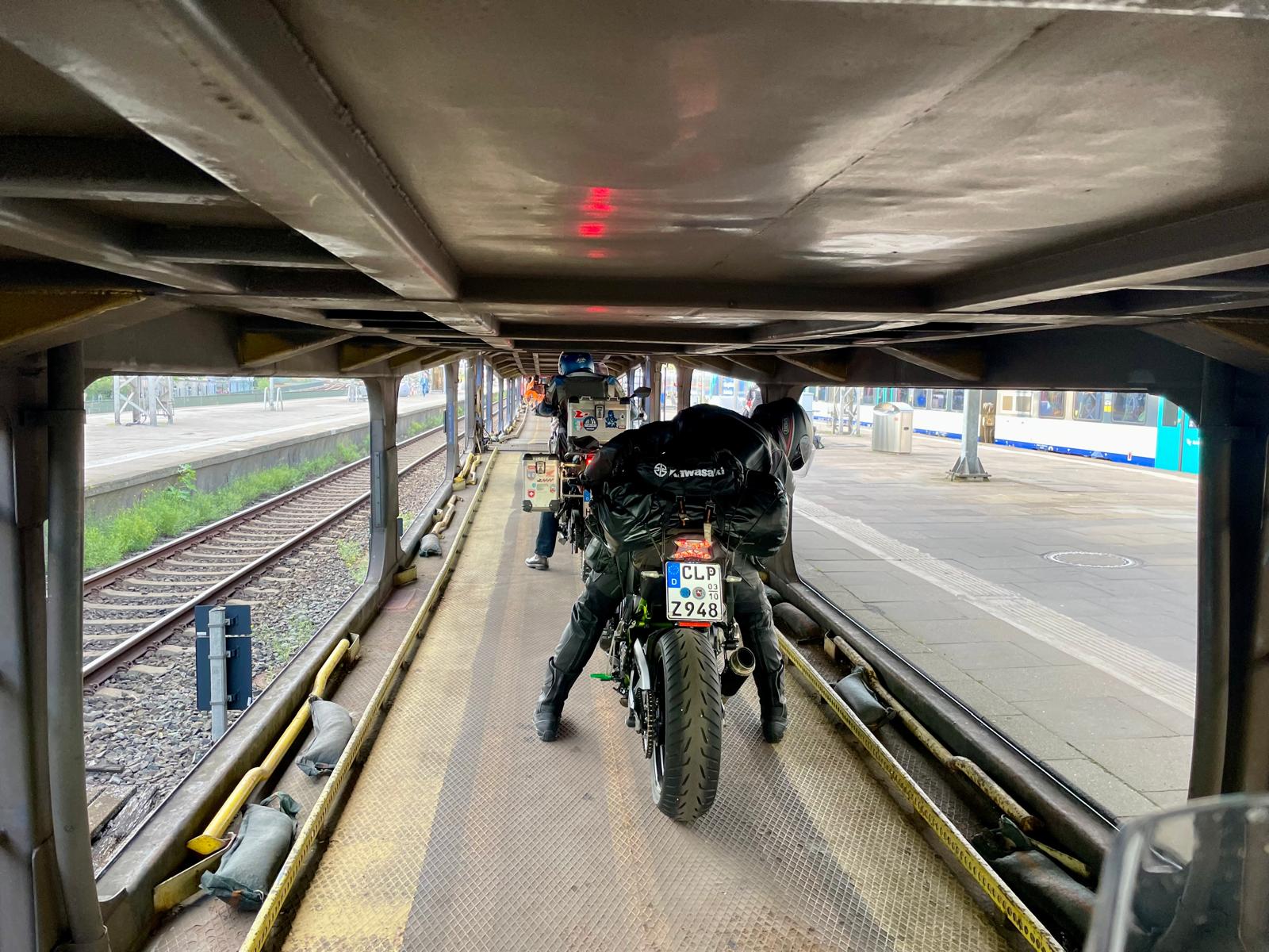 Die Anfahrt war aufgrund der Temperaturen und Staus recht mühsam und dauerte eine Stunde länger als geplant. Wir kamen aber rechtzeitig zur Verladung der Mopeds an. Nachdem beide Motorräder sicher verzurrt waren, deckten wir uns noch mit ein wenig Proviant für die Nacht ein und mit einer Stunde Verspätung ging es dann Richtung Süden. Wir hatten diesmal ein ganzes Abteil für uns beide gebucht, somit hatten wir ausreichend Platz. Nach dem Essen, ein paar Geschichten und einem Bier für die Bettschwere bauten wir unsere Betten auf, die allerdings eher Pritschen waren. Für eine Nacht muss das gehen…