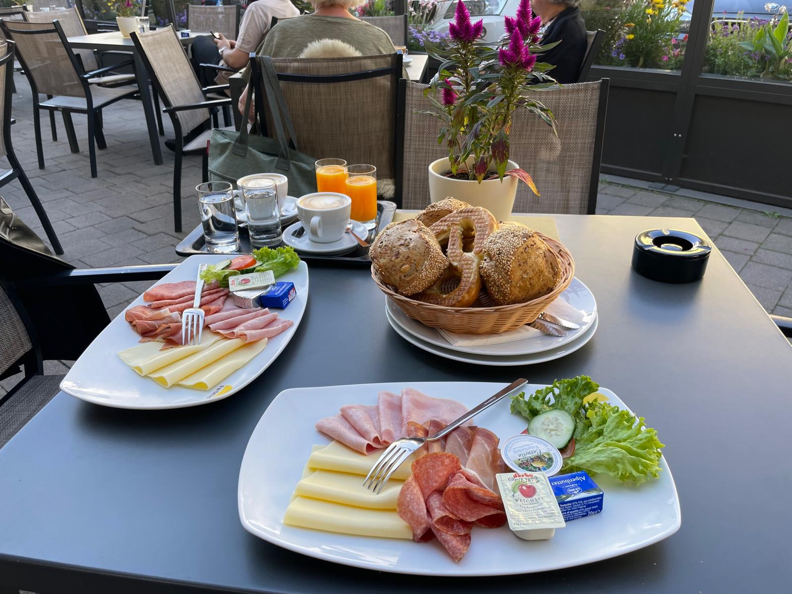 Nachdem wir unsere Zimmer bezogen hatten, trafen wir uns auf der Hotelterrasse und nach dem heißen Tag schmeckte das Bier hervorragend und das Essen war ebenfalls sehr lecker.