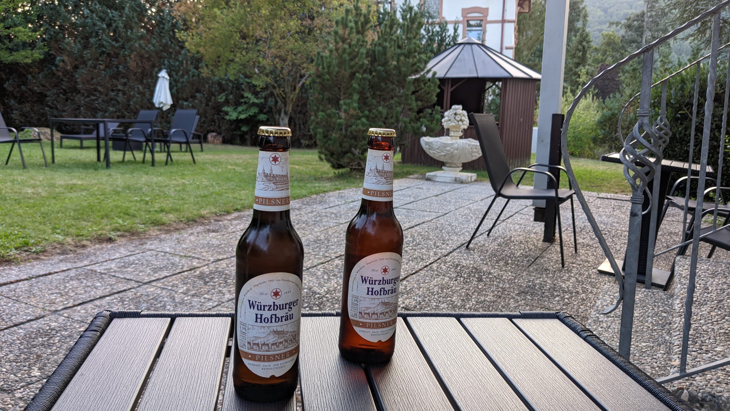 Stefan und ich machten uns dann auf nächste Etappe nach Hause. Es war leicht bewölkt und angenehm frisch, als wir starteten. Wir hatten gute 300 km Strecke vor uns. Enstpanntes Cruisen über die Landstraßen mit vereinzelten kurvigen Einlagen ließen uns gut voran kommen. Bis die erste Straßensperrung auftauchte… OK, das kennen wir ja von den früheren Touren. Am Wochenende kann man ja meist trotzdem durch fahren. Also fuhren wir eine kurze Offroad-/Schotterstrecke, danach ging es ganz normal weiter. Kurze Zeit später kam die nächste Sperrung, dort war dann aber die ganze Brücke abgebaut, so dass wir tatsächlich wieder zurück mussten. Na gut, ist ja nicht so schlimm. Dann kam die nächste Umleitung, die uns wieder ein paar Zusatzkilometer bescherte. Einige Zeit später führte uns die Route an eine kleine Fähre, wo uns die Dame am Anleger eröffnete, dass die Fähre gerade Pause macht. Wir hätten mindestens eine halbe Stunde warten müssen, also suchten wir uns eine alternative Route über den Fluß. Es kamen dann noch ein paar weitere gesperrte Ortsdurchfahrten und mehrere Umleitungen dazu. Mittlerweile hatte die Sonne auch ihre Stärke der letzten Tage zurückgewonnen und brachte uns nochmal ins Schwitzen. So standen dann bei unserer Ankunft am Hotel mehr als 360 km auf der Uhr. Trotz aller Hindernisse war es eine gute Fahrt, nur Fotos haben wir keine gemacht. Nachdem wir wieder vorzeigbar waren, suchten wir ein Restaurant in ‚Staatsbad Brückenau‘. Die vom Hotelmitarbeiter empfohlenen ‚Rhönstuben‘ sahen sehr heruntergekommen aus und sind bestimmt schon über ein Jahr geschlossen. Daher fiel unsere Wahl auf das ‚Ristorante Castello Belvedere‘. Und das war wirklich ausgezeichnet. Stefan war begeistert, als er ‚Vitello Tonnato‚ auf der Karte entdeckte. Ich kannte das nicht, also musste das natürlich probiert werden und es war sehr gut. Als zweiten Gang wählten wir Tagliolini mit frischen Trüffeln, die ebenfalls exzellent waren. Nach einem abschliessenden Espresso machten wir uns auf den Rückweg, holten uns noch einen Absacker am Hotel und setzen uns noch ein wenig in den Garten, bevor es in den wohlverdienten Feierabend ging.