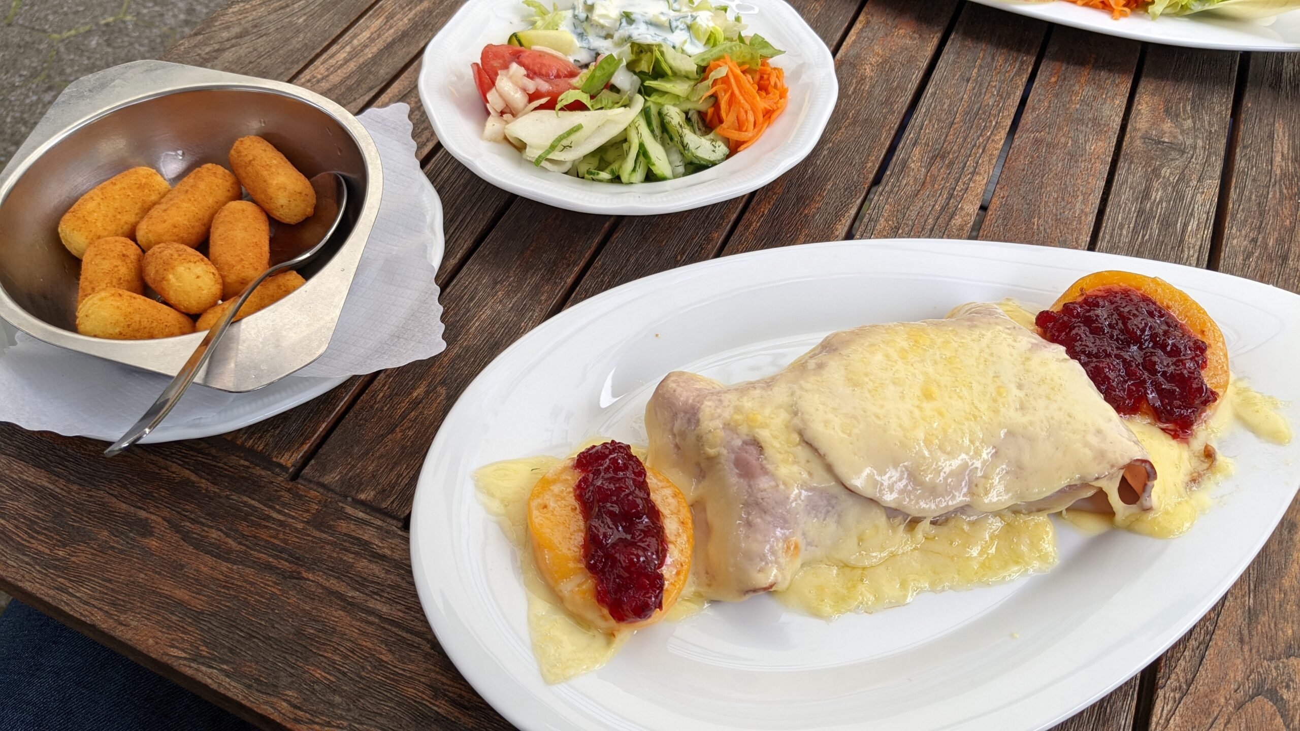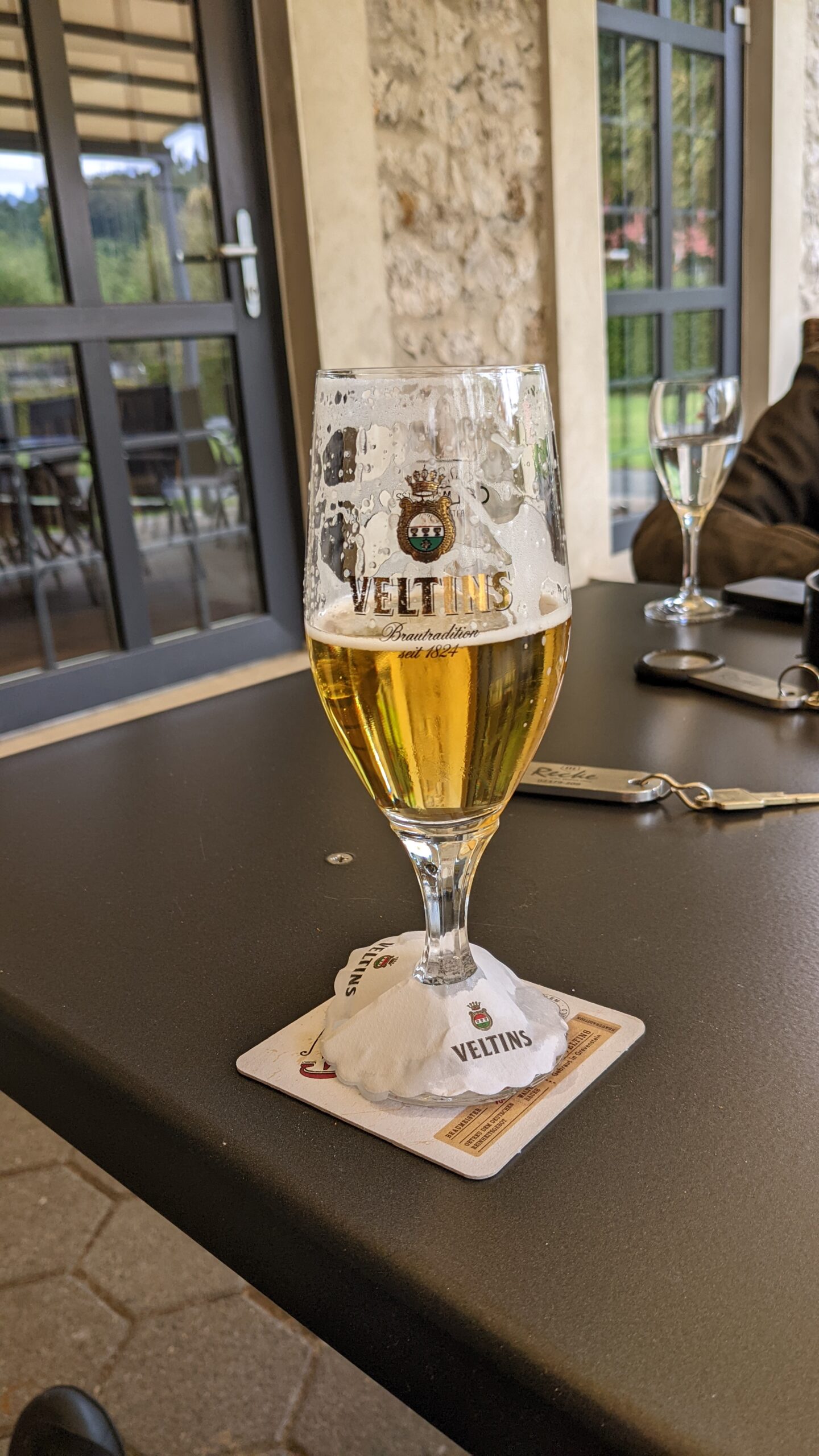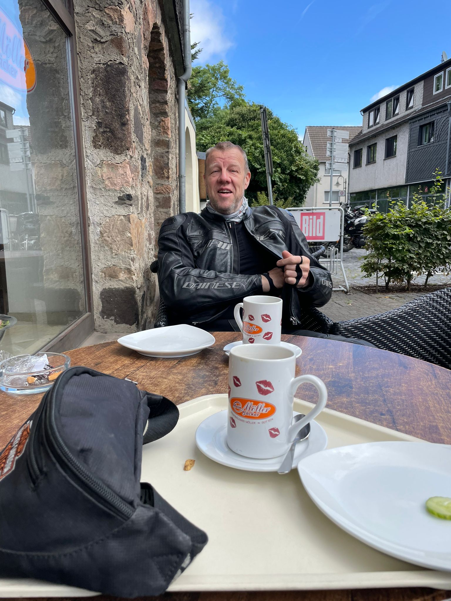 Die Route über die kleinen Nebenstrecken machte richtig Spaß und es kam keine Langweile auf. Allerdings machte uns der Temperatursturz von über 30° auf ca. 15° ein wenig zu schaffen. Das Schwitzen in den vergangenen Tagen war zwar nicht so angenehm, aber die „Kälte“ zehrte ziemlich an der Kondition. Bei der Tankpause musste auch unbedingt ein heißer Kaffee her. Wir waren mittlerweile im Sauerland angekommen und es war irgendwie so ein Gefühl von „nach Hause kommen“. Wir hatten noch eine kurzen Abstecher zu meinem Lieblingssohn und meiner Lieblingsschwiegertochter auf dem Plan, dann kam aber die Mutter aller Straßensperrungen dazwischen. Im Nachbardorf fand ein Volksfest statt und alle Durchfahrtsstraßen waren abgesperrt. Wir versuchten alle möglichen Nebenstraßen, es war kein Durchkommen. Selbst als wir einen Radweg benutzten, standen wir am Ende wieder direkt vor einem Polizeiauto. Also stieg ich ab und sprach eine Gruppe Einheimischer an. Da bekamen wir einen Tipp, hinter der Friedhofsmauer einen kleinen, geschotterten Fußweg zu nutzen, der von hinten auf einen Parkplatz führt, über den wir die letzte Sperre umgehen könnten. Die nette Dame forderte nur einen Cappuccino als Gegenleistung, wenn wir uns mal wieder treffen sollten… Ihr Geheimtip brachte uns dann tatsächlich aus dem Dorf heraus! So konnten wir bei Lukas, Aline und Kenai noch auf ein Schwätzchen und einen Kaffee vorbeischauen, bevor wir dann an unserer letzten Station, Haus Recke, ankamen. Wir hatten etliche, sehr gute Unterkünfte auf unserer Tour, aber beim Ulli ist es doch am besten. Wir wurden, wie immer, direkt nach dem Abstellen der Motorräder noch in der Garage begrüßt. „Was wollt ihr trinken? Setzt euch auf die Terrasse, ich bring’s euch.“